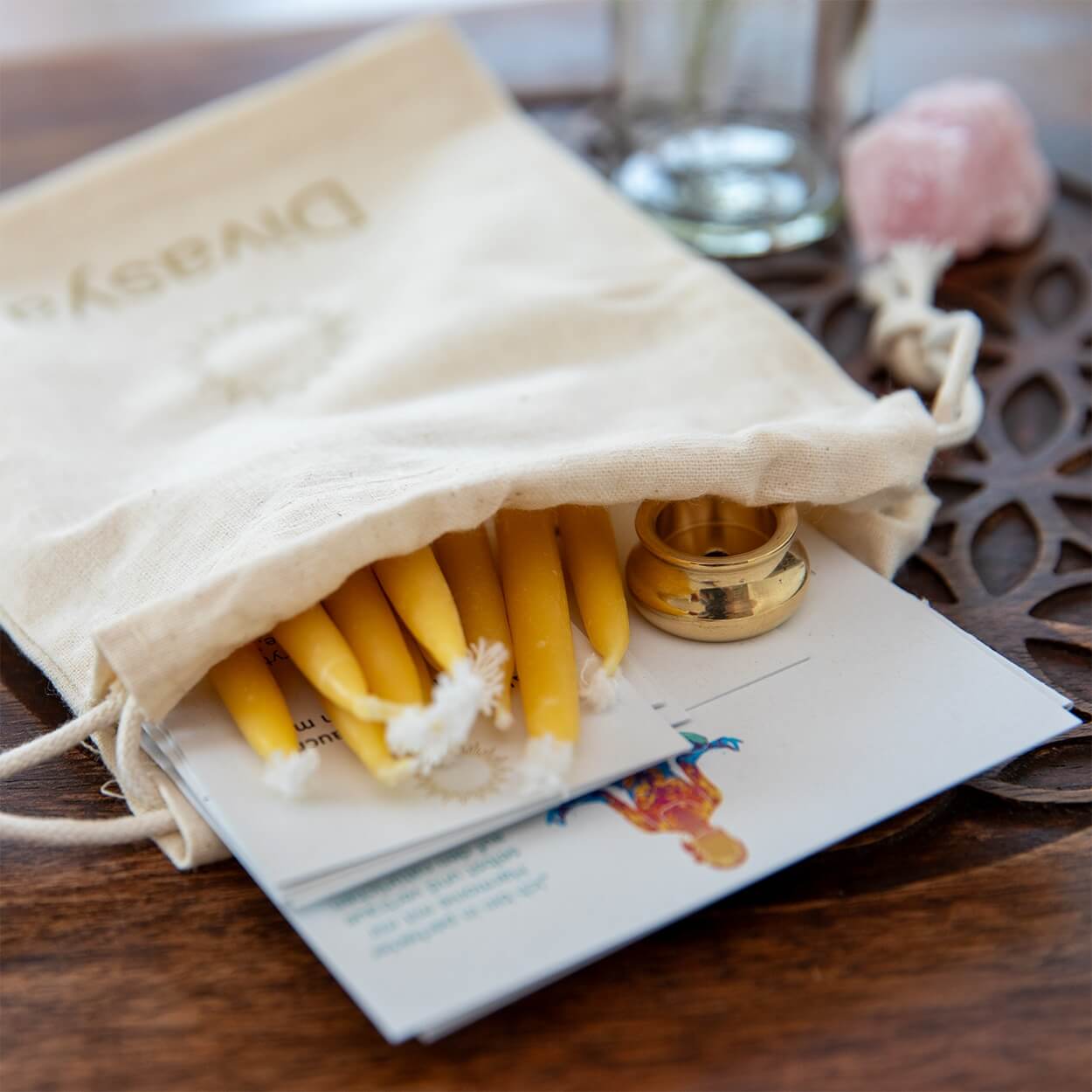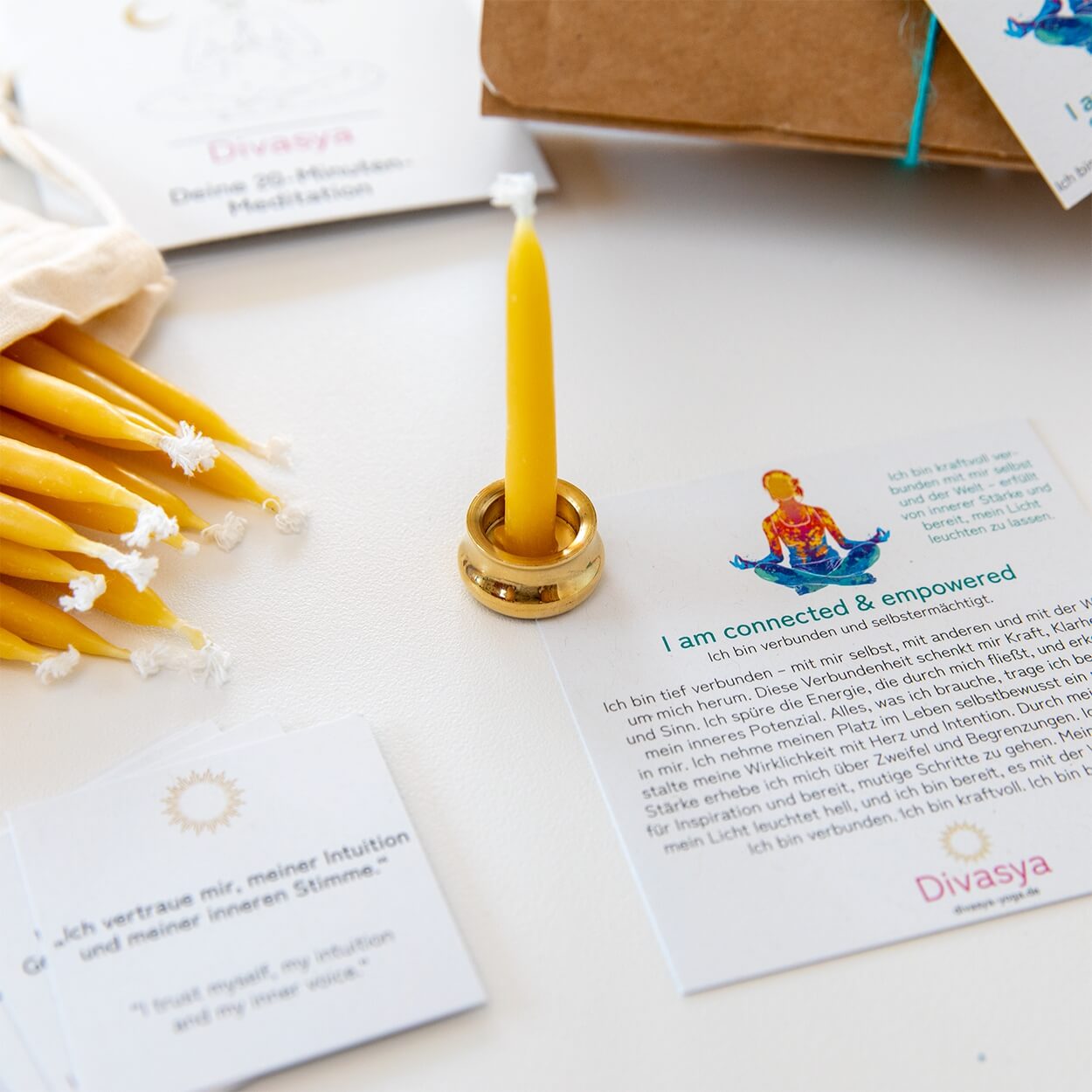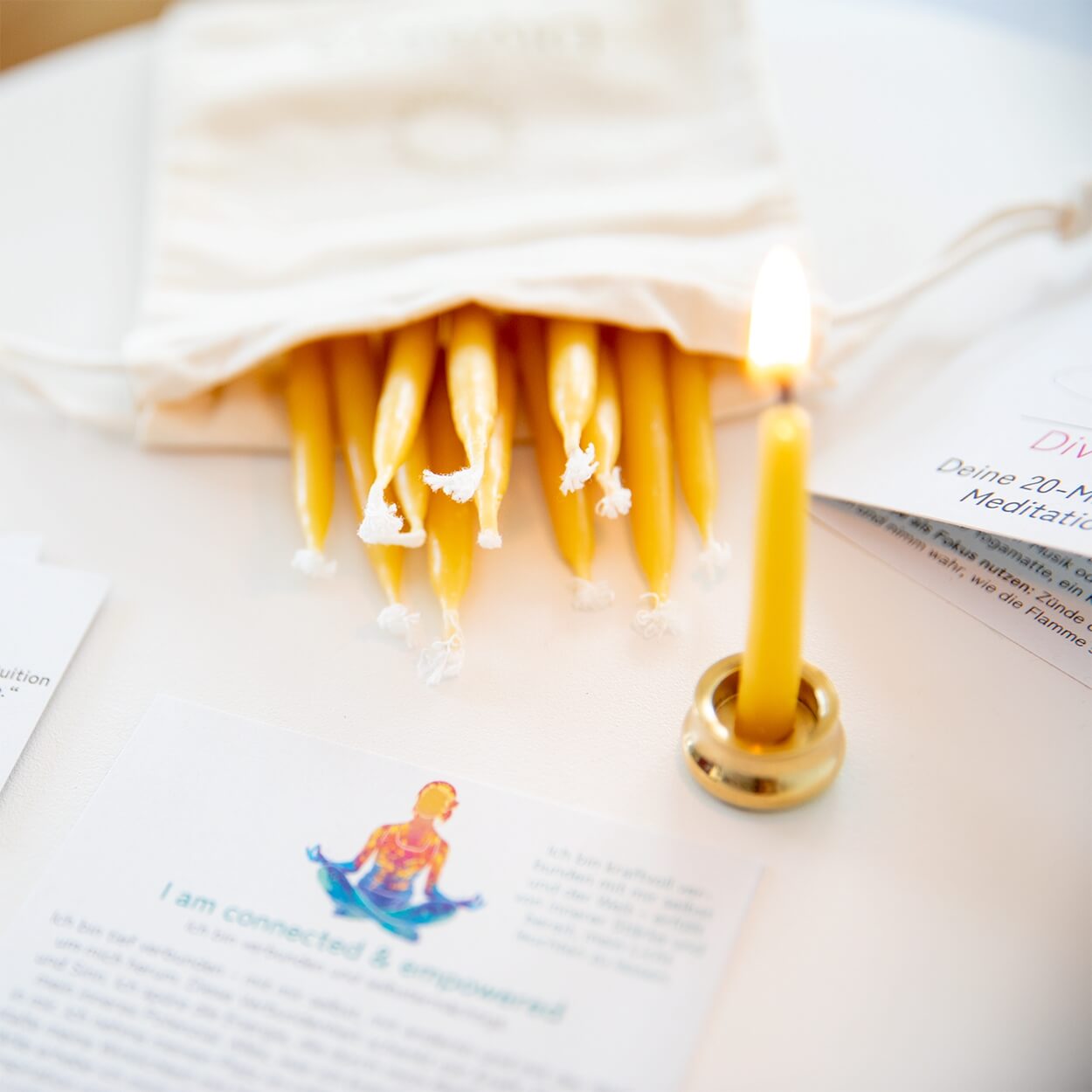 ✔ 12 x 20-Minuten-Kerzen (aus Bienenwachs) im Baumwollsäckchen – ideal für deine tägliche Meditation oder 20 Minuten Auszeit & Achtsamkeit.