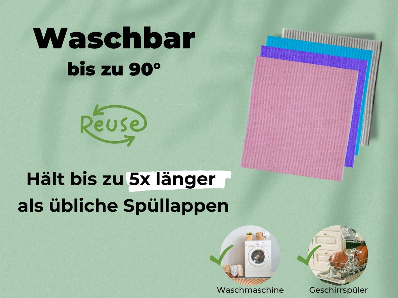 Anders als andere Reinigungstücher, können unsere Küchenlappen einfach in Waschmaschine oder Geschirrspüler gewaschen werden (max. 90 Grad). Spültuch, Schwammtuch waschbar ist damit nicht nur hygienischer, sondern hält länger als andere Küchentücher Baumwolle