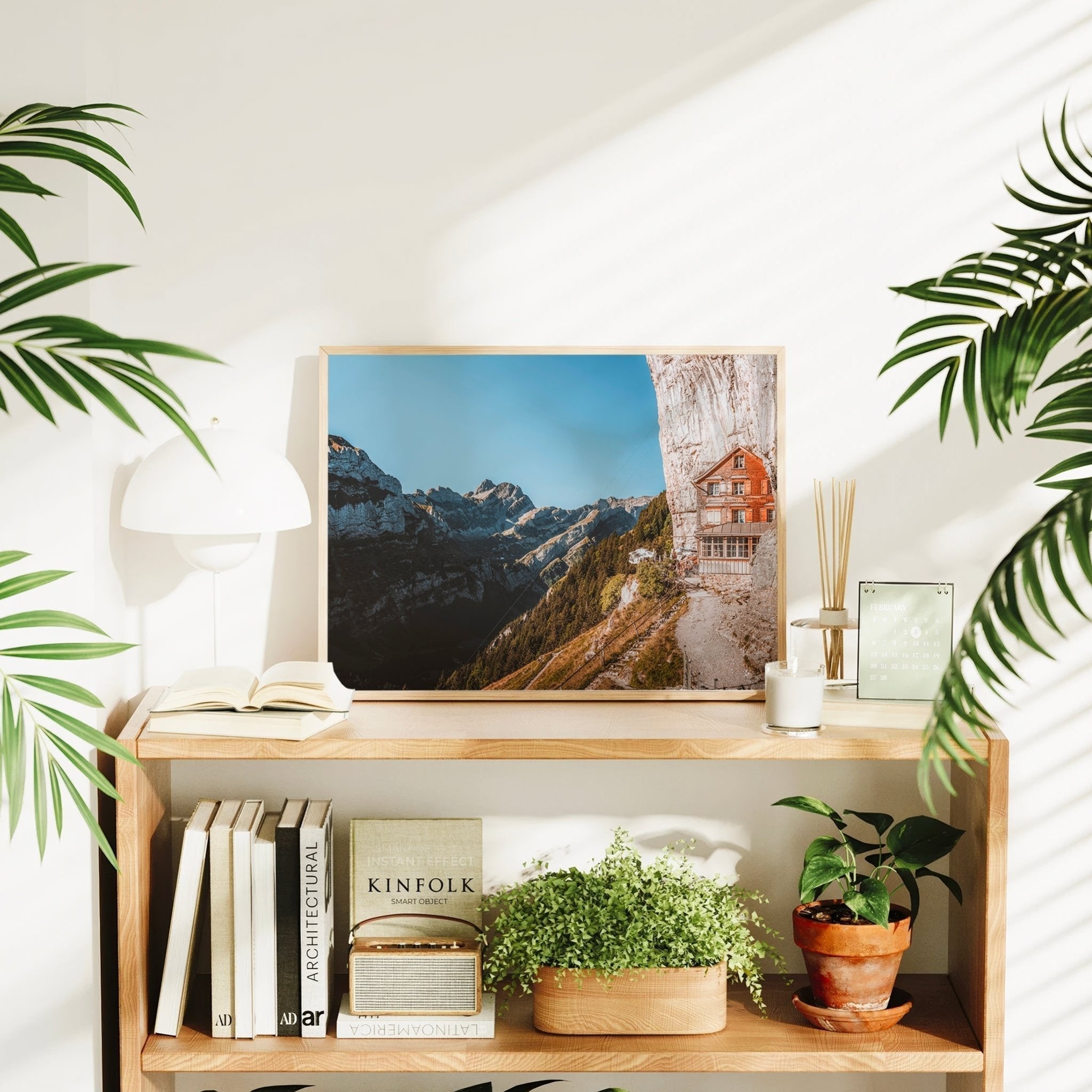 The historic Aescher Guesthouse, perched on a Swiss Alps cliffside with stunning mountain views. What Makes Our Prints Special Each... Lesen Sie mehr