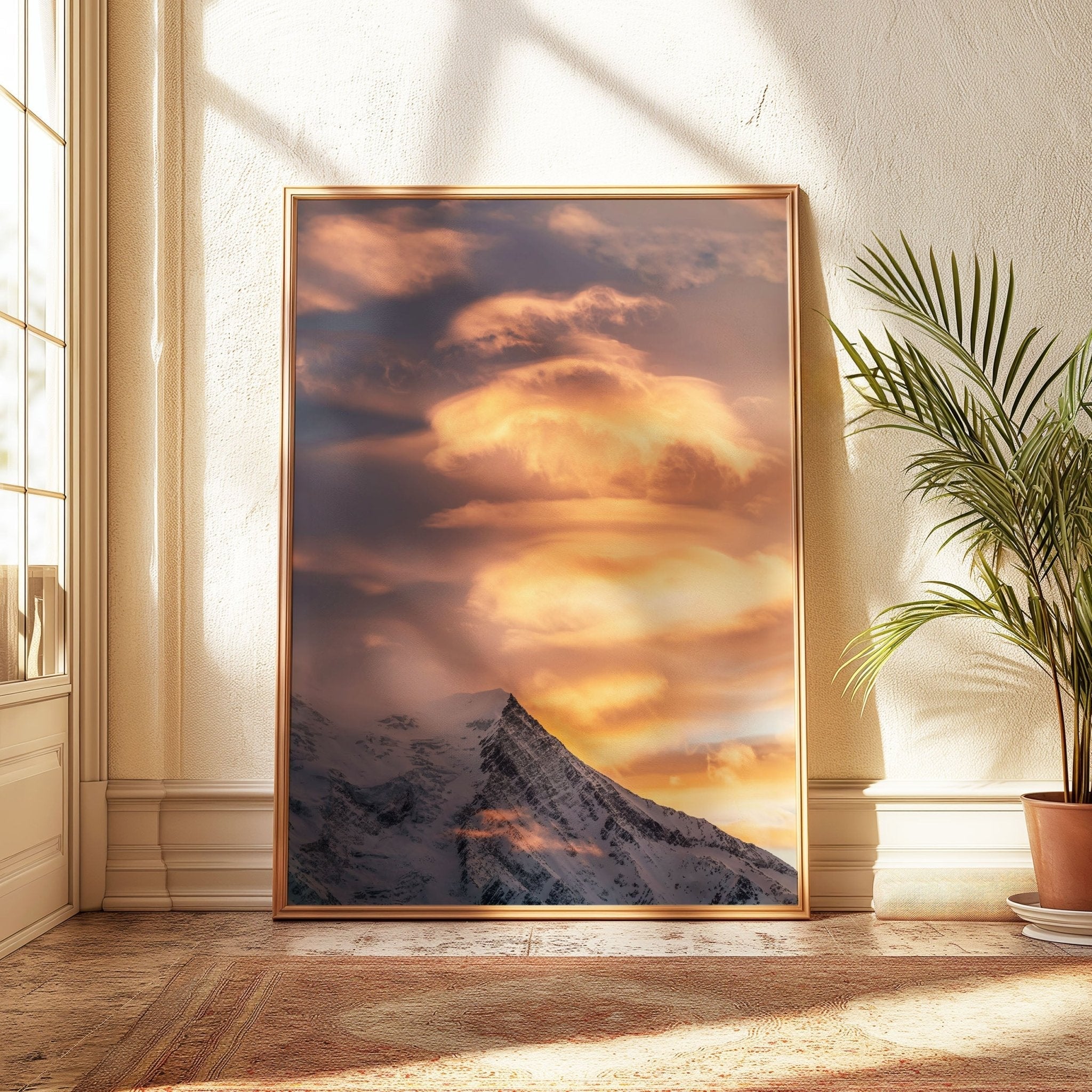 A dramatic triptych print showcasing Aiguille du Chardonnet, Aiguille du Goûter, and Aiguille du Midi glowing in the evening light... Lesen Sie mehr