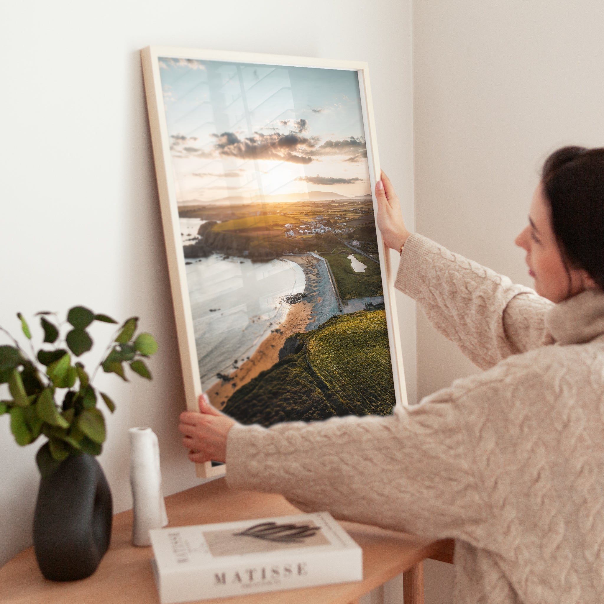Bring the soft glow of the Irish coast into your space with this aerial photograph of Annestown Beach at sunset. Captured from above, the image highlights the sweeping curve of golden sand, lush green fields, and the delicate shimmer of evening light over the Atlantic. Printed on premium matte paper, this fine art print adds a touch of nature, calm, and depth to any interior.