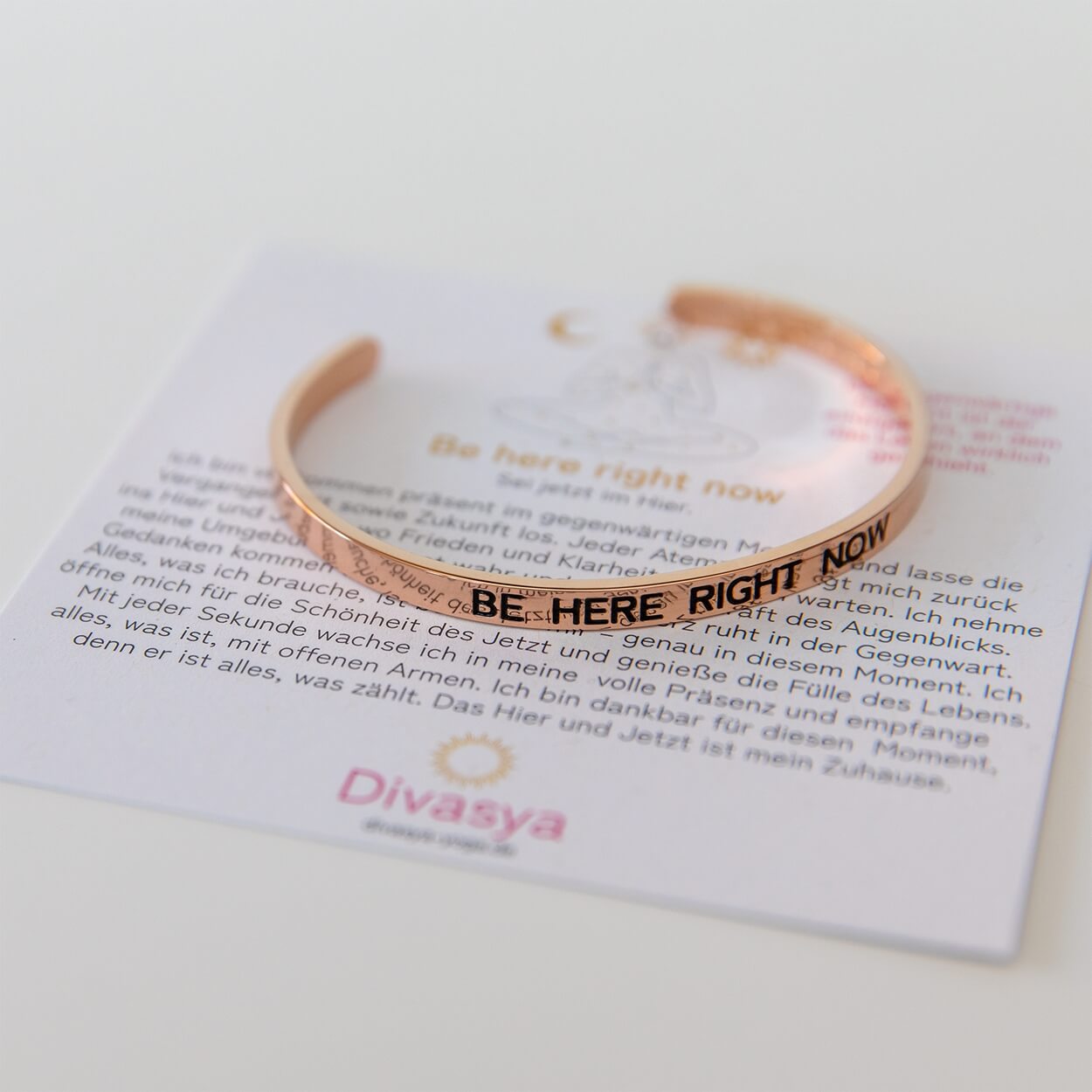 Spüre die Schönheit des Augenblicks – mit unserem eleganten Armreif mit Gravur „Be here right now“. Dieser filigrane spirituelle Schmuck aus hochwertigem, langlebigem Edelstahl ist edel rosévergoldet und trägt eine präzise eingearbeitete Lasergravur, die Dich liebevoll daran erinnert, im Hier und Jetzt zu leben.