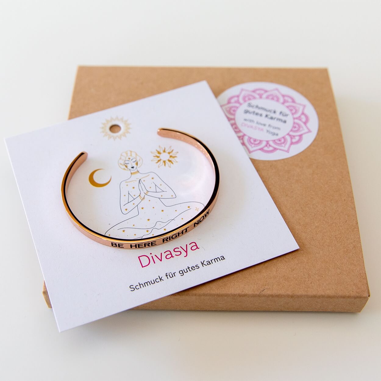 Als besonderes Extra erhältst Du eine kleine Karte mit einer inspirierenden Botschaft passend zum Mantra dieses Armreifs: "Der gegenwärtige Moment ist der einzige Ort, an dem das Leben wirklich geschieht."