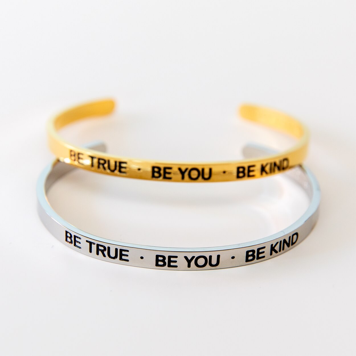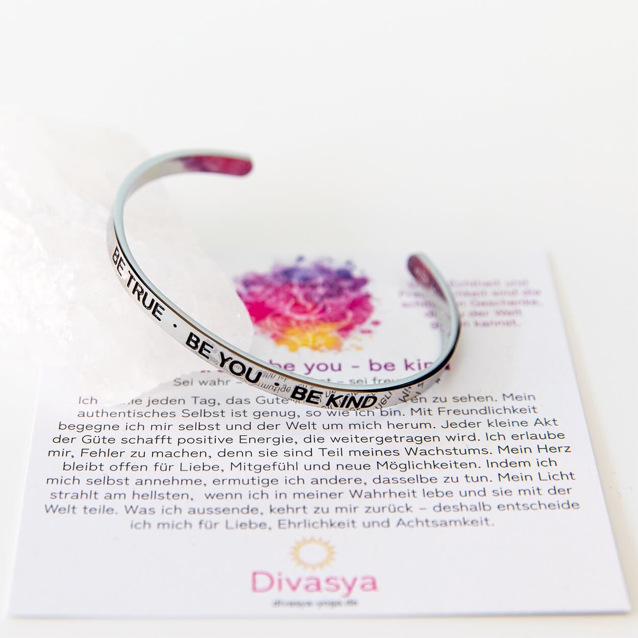 Entdecke unseren stilvollen Armreif mit Gravur aus hochwertigem, langlebigem Edelstahl in edlem Silberfinish. Mit der inspirierenden Mantra-Gravur „Be true – be you – be kind“ begleitet Dich dieser besondere Schmuck Tag für Tag auf Deinem persönlichen Weg. Der präzise per Laser aufgebrachte Schriftzug macht diesen spirituellen Schmuck zu einem einzigartigen Begleiter für mehr Achtsamkeit, Selbstliebe und Freundlichkeit im Alltag.
