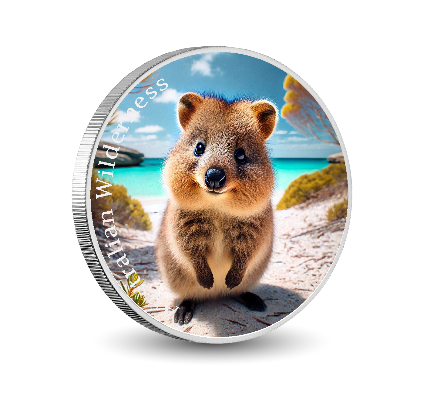 Featuring an adorable quokka perched on a pristine sandy beach, with turquoise waters and rocky islands as the backdrop, this coin radiates joy and warmth. The cheerful expression and fluffy round face of the quokka make it an irresistible symbol of friendship and happiness. The vibrant scenery showcases the breathtaking beauty of Rottnest Island, immersing you in the splendor of Australia’s unique wildlife and landscape.