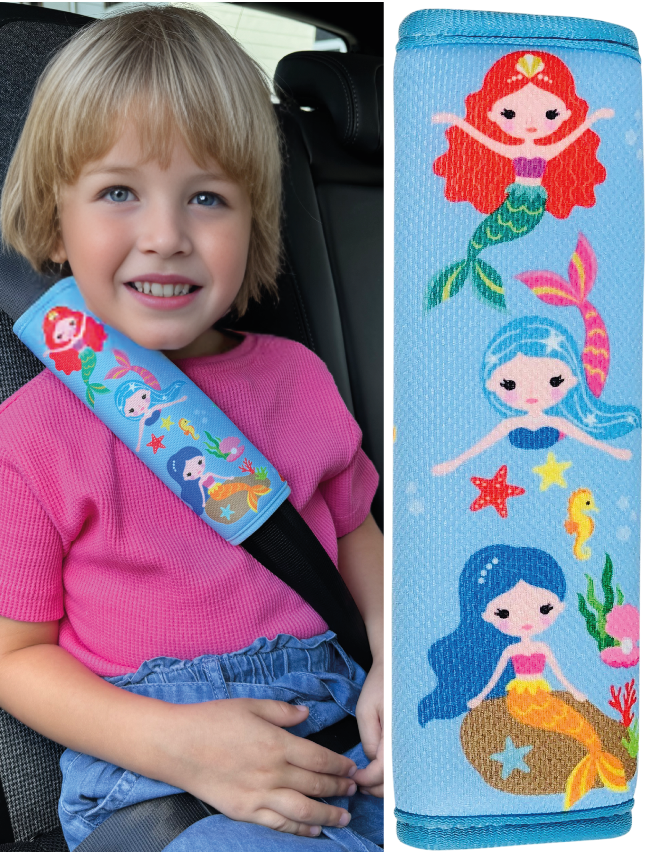 🧜♀️ KINDERGERECHTES MEERJUNGFRAUEN-MOTIV: HECKBO Gurtschoner in Hellblau mit liebevoll gestaltetem Meerjungfrauen-Design sowie bunten Muscheln, Seesternen, Seepferdchen und Luftblasen – ein Must-have für kleine Unterwasserfans.