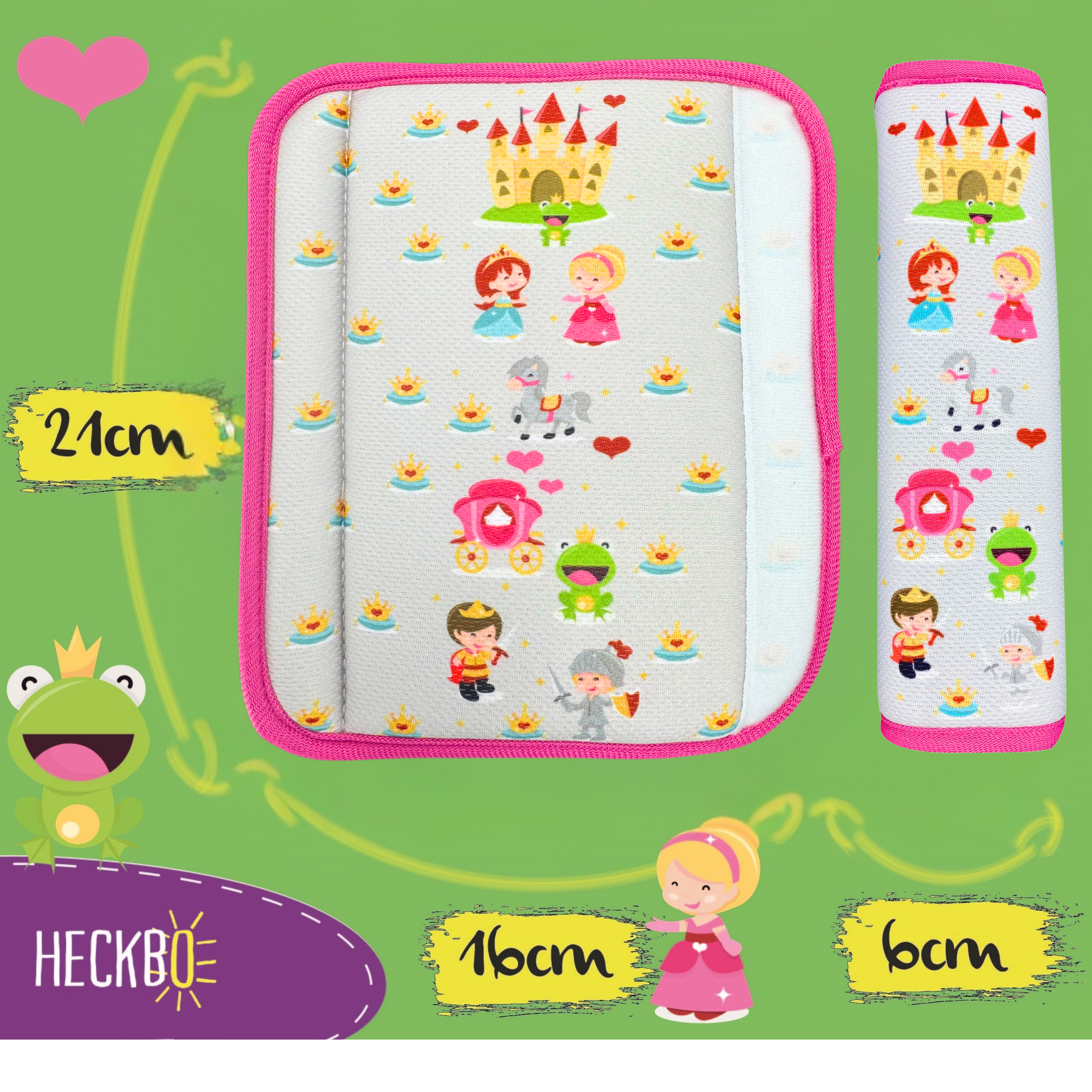 Sie erhalten 1 oder 2 HECKBO Gurtkissen mit einem liebevoll gestalteten Froschkönig-Motiv – farbenfroh bedruckt mit Prinz, Prinzessin, König, Schloss, Ritter, Pferd und Kutsche. Ein echtes Must-have für kleine Prinzessinnen und Märchenfans!