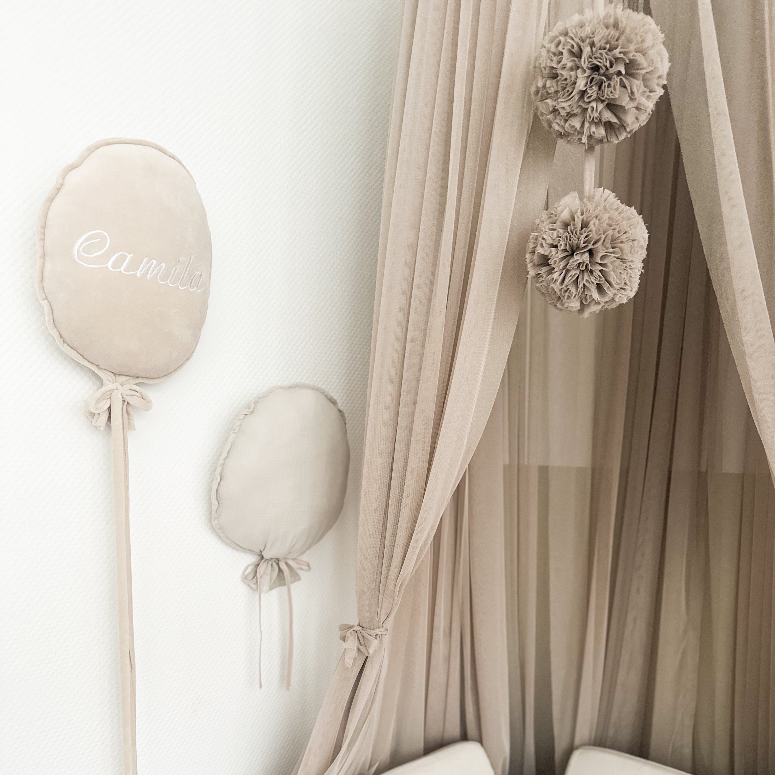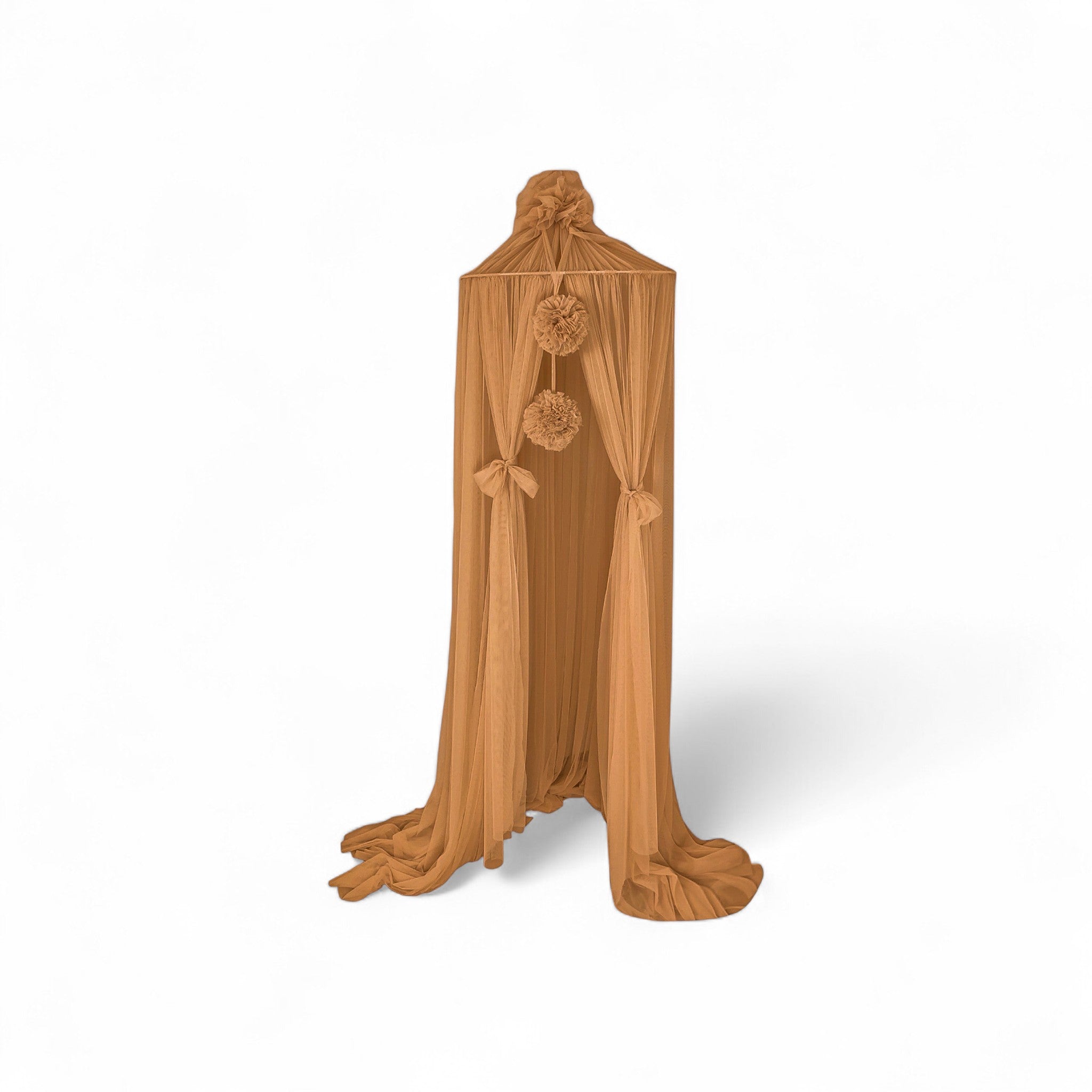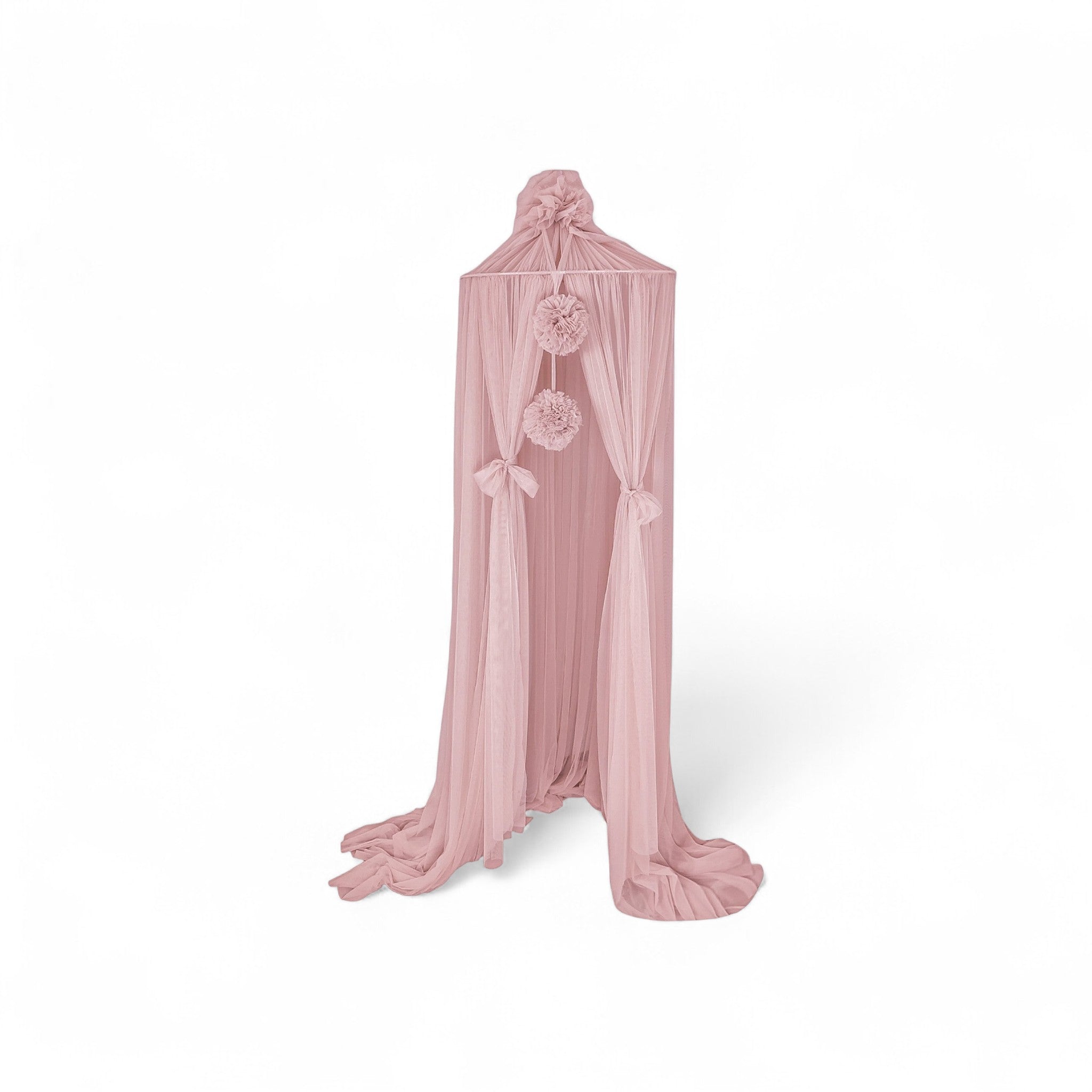 Der zarte, fließende Tüll fällt elegant bis zum Boden und sorgt gemeinsam mit den verspielten Pom-Poms und den hübschen Schleifen für eine märchenhafte Optik. Mit nur wenigen Handgriffen lässt sich der Baldachin anbringen und wird sofort zum Blickfang im Raum.