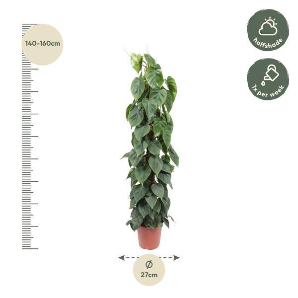 Der Philodendron Scandens am Moosstock ist eine äußerst dekorative und pflegeleichte Zimmerpflanze, die mit ihrem tropischen Charme überzeugt. Mit einer Höhe von ca. 150cm und einem Ø27cm-Topf eignet sie sich ideal als natürliches Gestaltungselement für Wohnzimmer, Büros oder Wintergärten.