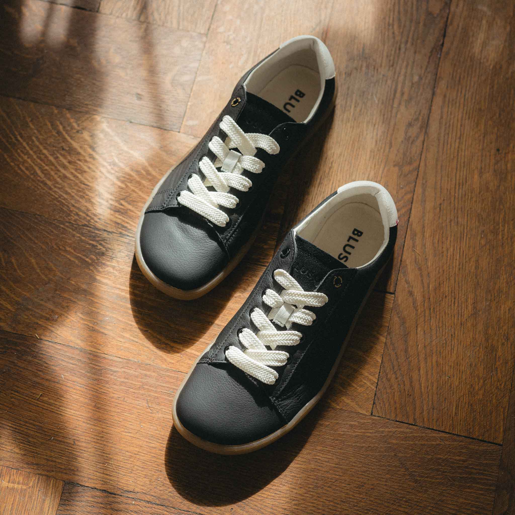 Lost in Details. Schwarzes Glatt- und Veloursleder gepaart mit einer weißen Zehenkappe, roten Nähten und strahlend weißen Schnürsenkel machen diesen Sneaker zu einem modischen Hingucker. Dank eines atmungsaktiven Innenfutter-Mix aus biologischer Baumwolle und Mikrofaser sowie einer Innensohle aus superfunktionellem onSteam® trägt sich dieser Barfußschuh superkomfortabel und die Füße bleiben lange frisch.