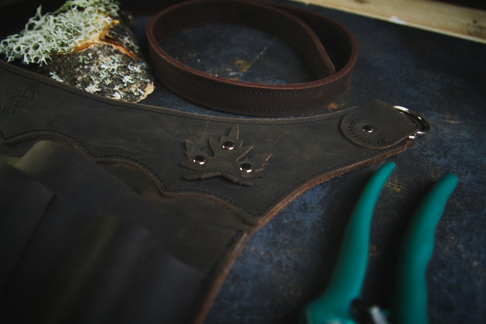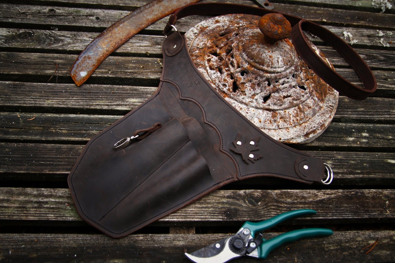 Der Garten Werkzeuggürtel ist aus so genanntem Crazy Horse Rindsleder in dunkelbraun gefertigt.