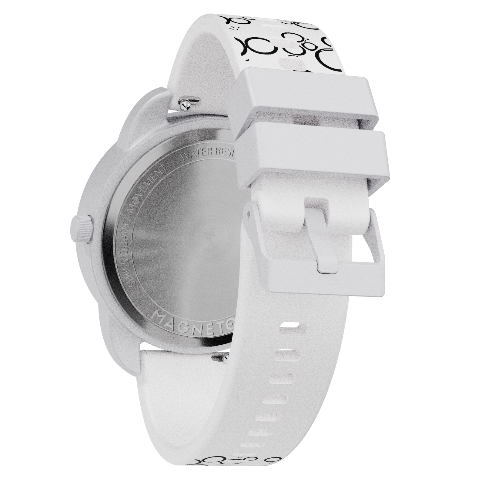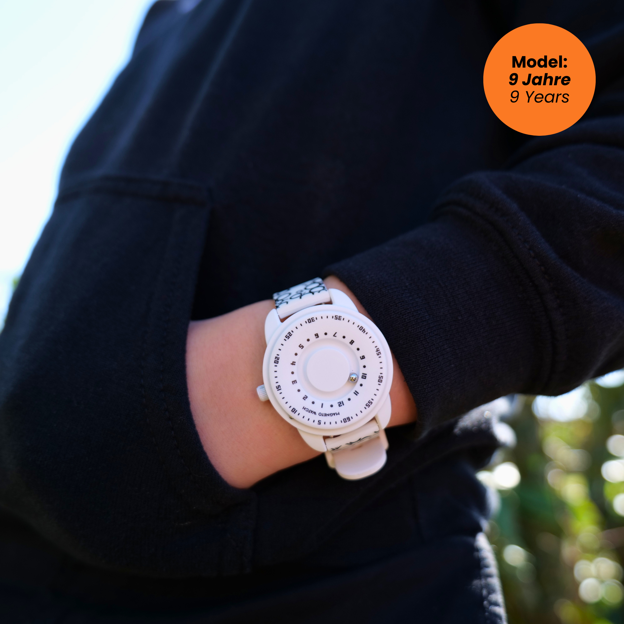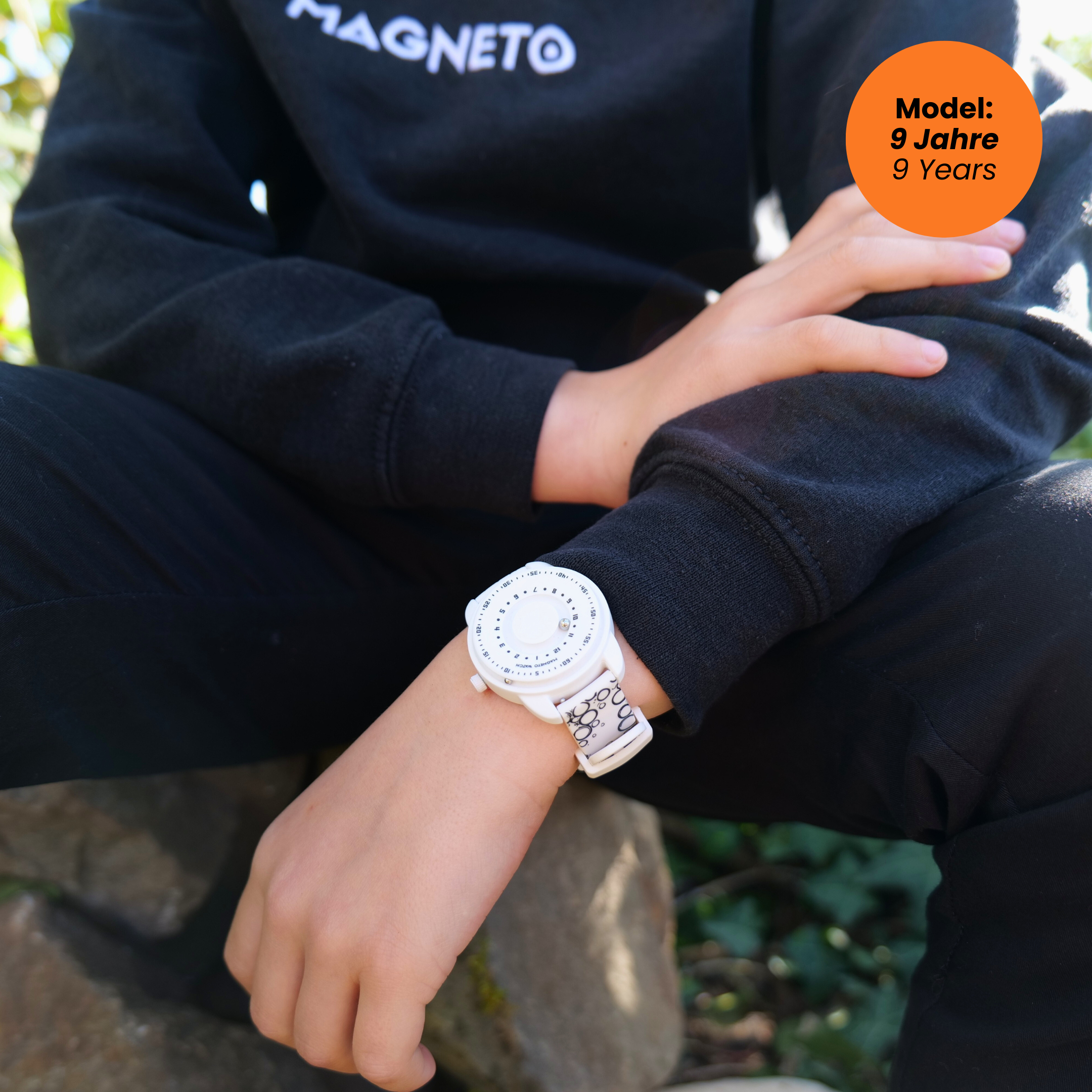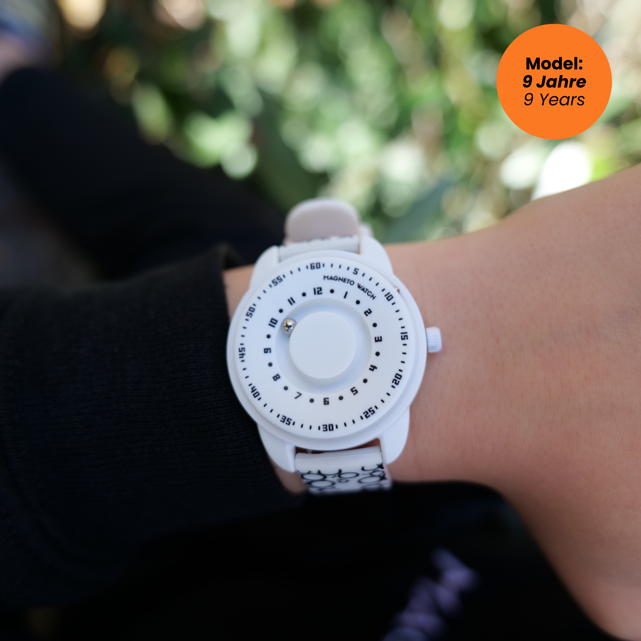 Bubbles White von Magneto Watch bringt frische Leichtigkeit an jedes Kinderhandgelenk. Statt herkömmlicher Uhrzeiger sorgen hier zwei Magnetkugeln – eine größere Innenkugel für die Stunden und eine kleinere Außenkugel für die Minuten – für ein außergewöhnliches Zeitablesen, das Kinder begeistert. Das hochwertige Kunststoffgehäuse (ABS) ist robust und dennoch angenehm leicht. Der Clou ist das weiße Silikonarmband mit blasenartigem Print, das an Seifenblasen erinnert und perfekt zum Namen „Bubbles“ passt. So wird das Erlernen der Uhrzeit zum spannenden Erlebnis – inklusive einem frischen, coolen Look am Handgelenk.