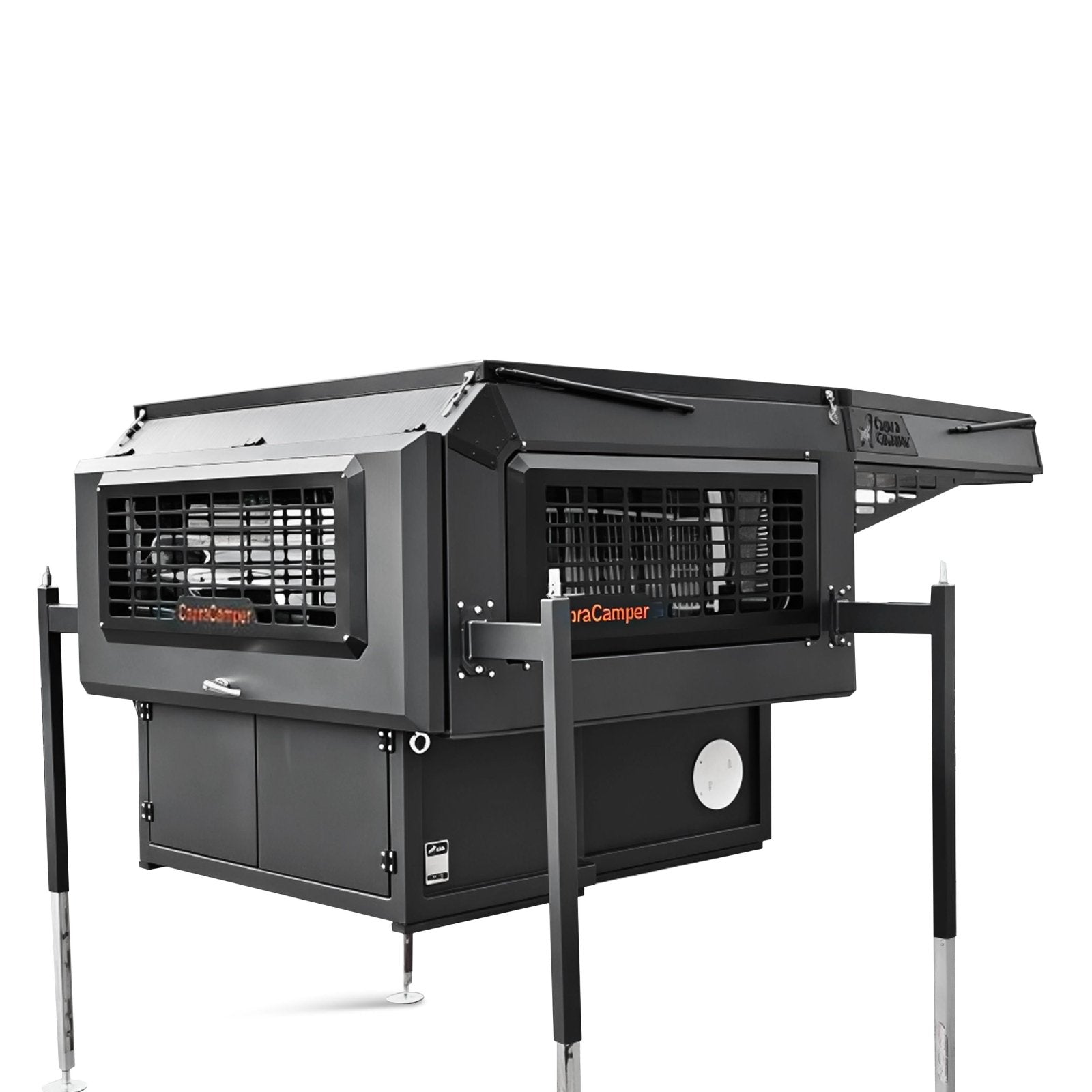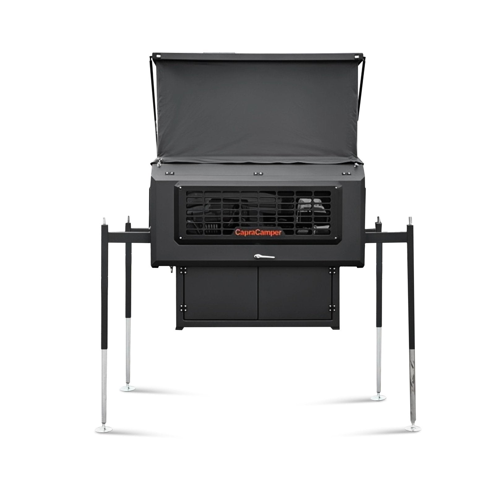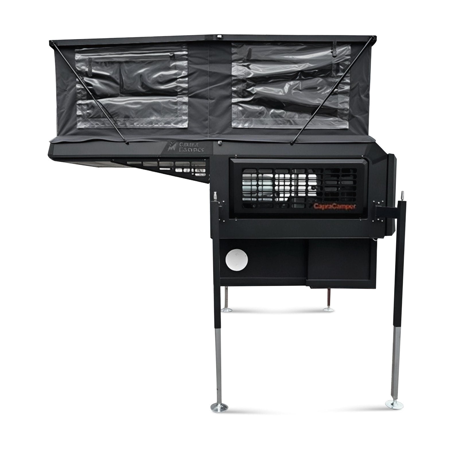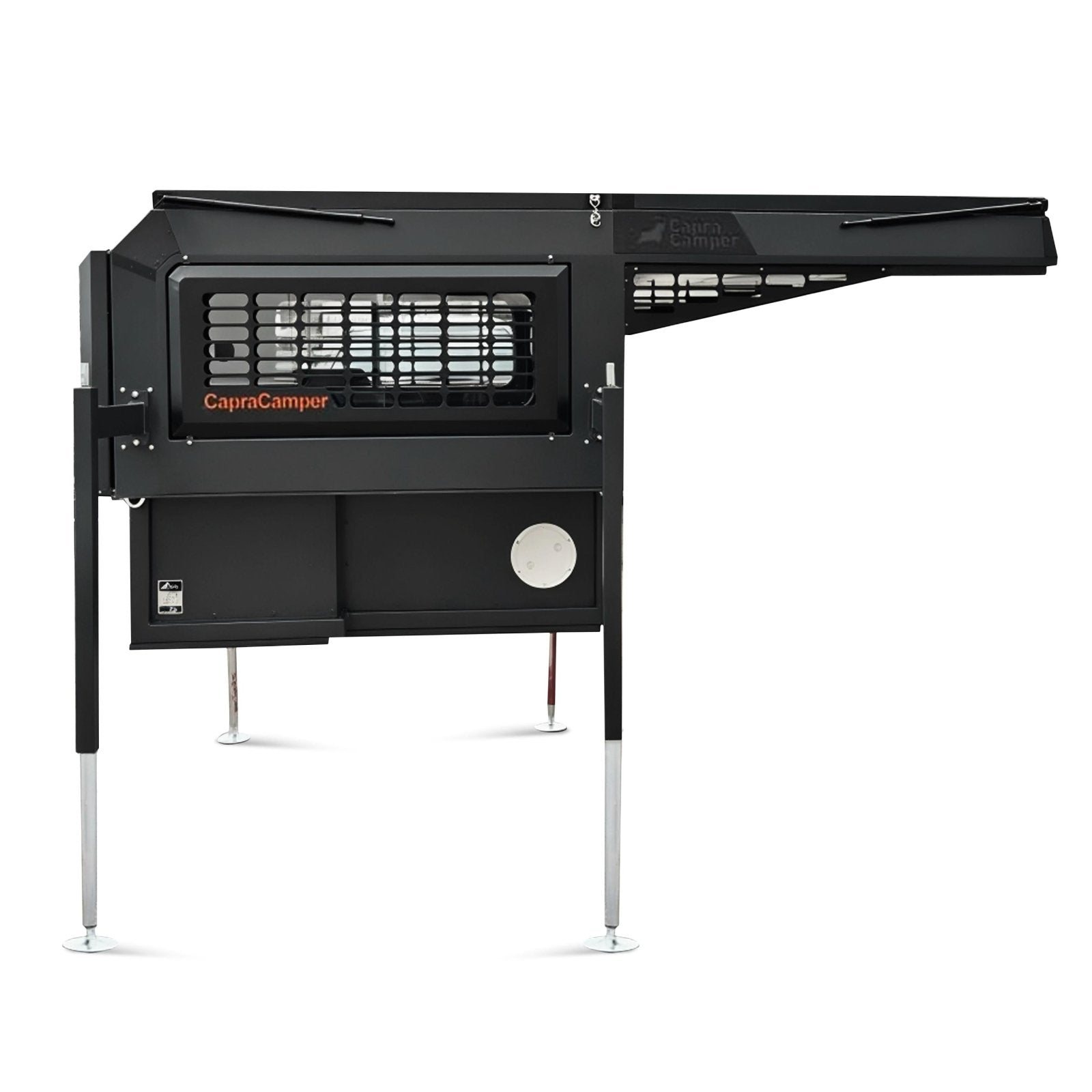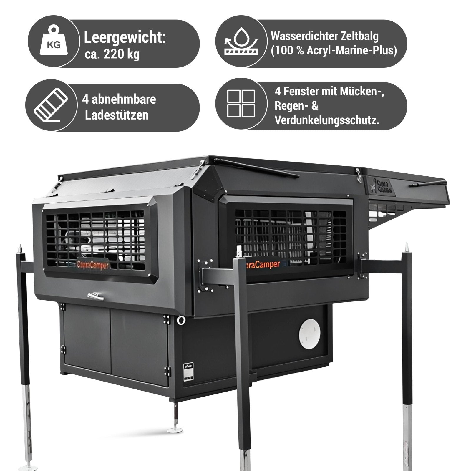 Der CapraCamper steht für robuste, bewährte Offroad-Qualität – entwickelt für alle, die eine dauerhaltbare, alltagstaugliche Aufsetzkabine suchen. Das leichte Gesamtgewicht von ca. 220 kg, die 20 mm EPS-Isolierung mit Iso-Vlies und der wasserdichte Zeltbalg aus 100 % Acryl-Marine-Plus-Gewebe liefern eine Kombination aus Stabilität, Witterungsschutz und Komfort, die sich in der Praxis bewährt hat. Das Hubdach ermöglicht eine Stehhöhe von ca. 200 cm und verwandelt die Ladefläche in einen vollwertigen Wohnraum – vom Wochenendtrip bis zur Langstrecke.