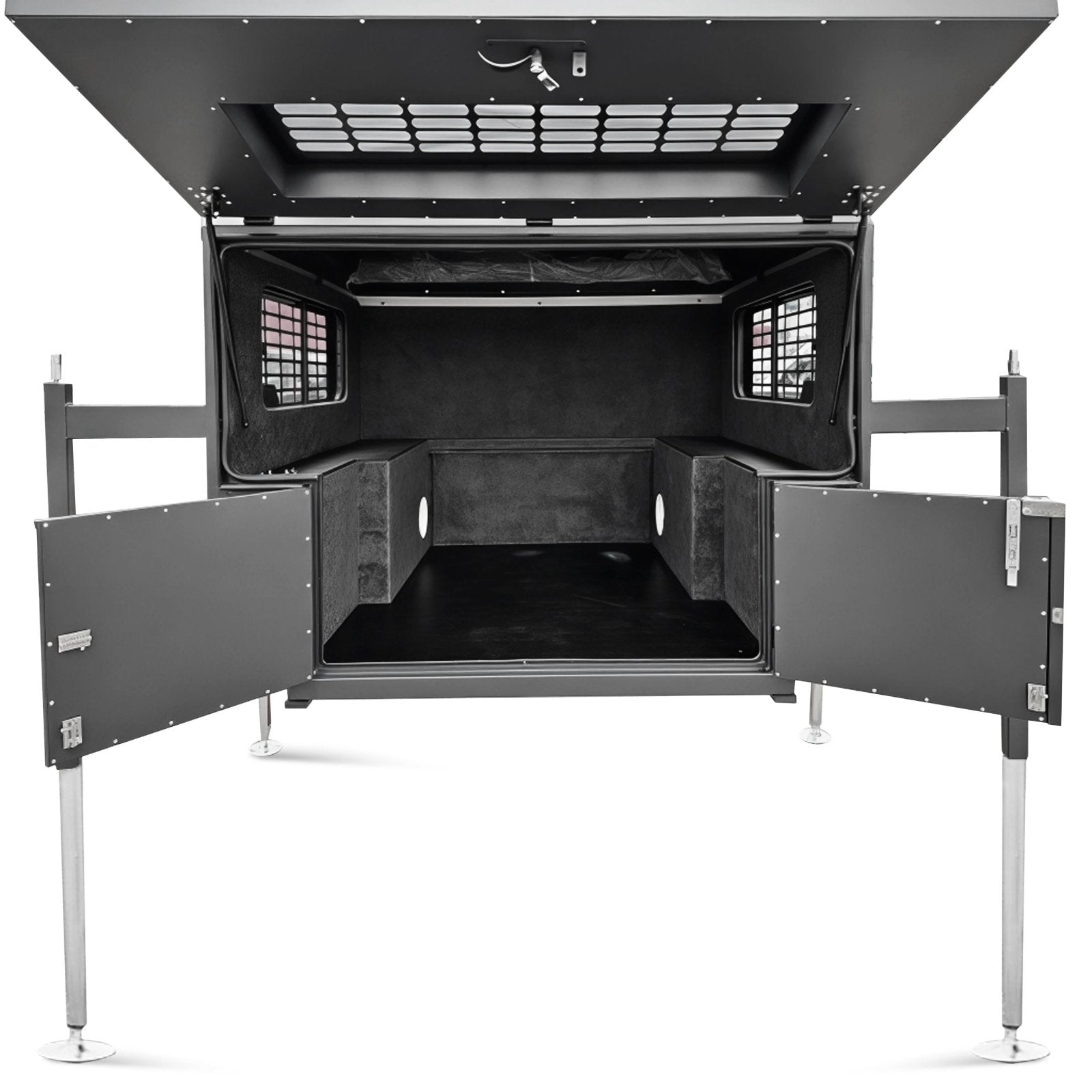 Im Betrieb überzeugt die Kabine mit solider Sicherheit: Zwei Schiebefenster aus KFZ-Sicherheitsglas, abnehmbare Offroad-Fenstergitter aus Aluminium sowie ein abschließbares Schloss mit zusätzlicher Innenverriegelungschützen Ausrüstung und Privatsphäre. Vier Fenster im Zeltbalg sorgen dank Moskito-, Regen- und Verdunkelungsschutz für Belüftung, Sichtschutz und Ruhe – unabhängig vom Wetter. Zum Auf- und Absetzen gehören 4 abnehmbare Ladestützen für einen sicheren Stand, auch freistehend.