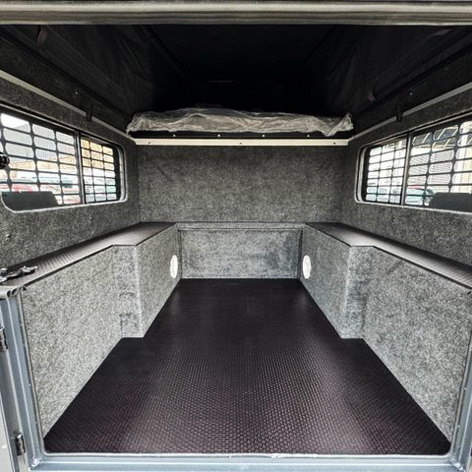 Der Innenraum ist auf funktionale Ordnung ausgelegt: klare Flächen, gut zugängliche Stauräume und ein leicht zu reinigender Boden – ideal für Camping, Jagd, Handwerk oder Overlanding. Kurz: ein belastbares Arbeits- und Wohnmodul, das die klassische Einfachheit pflegt und auf das man sich verlassen kann.