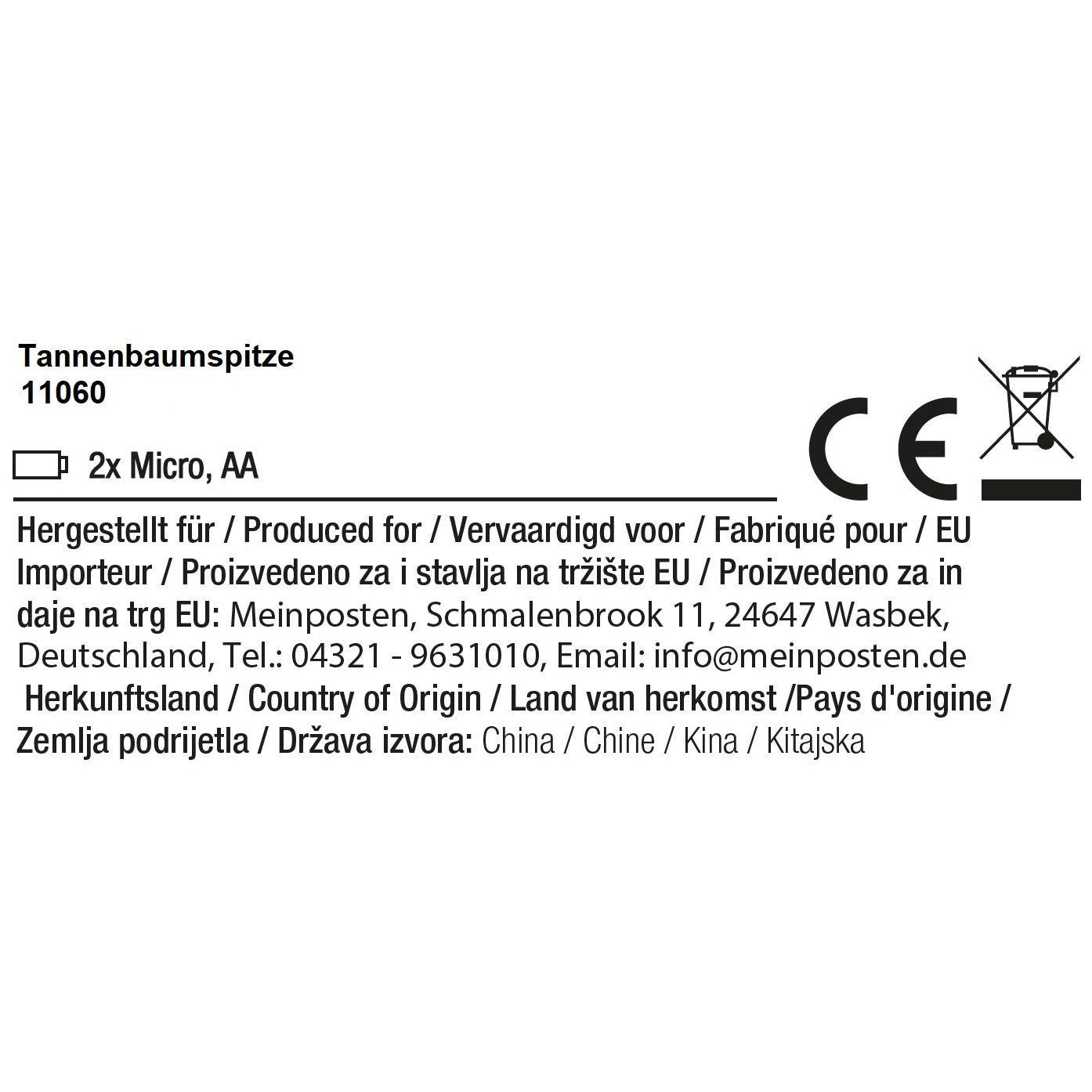 Verleihen Sie Ihrem Weihnachtsbaum mit der 35 cm großen LED-Christbaumspitze im silbernen Stern-Design eine besondere Note. Bis zu 10 warmweiße LED-Leuchten sorgen für eine sanfte Beleuchtung und der eingebaute Timer ermöglicht eine mühelose automatische Ein- und Abschaltung nach 6 Stunden.