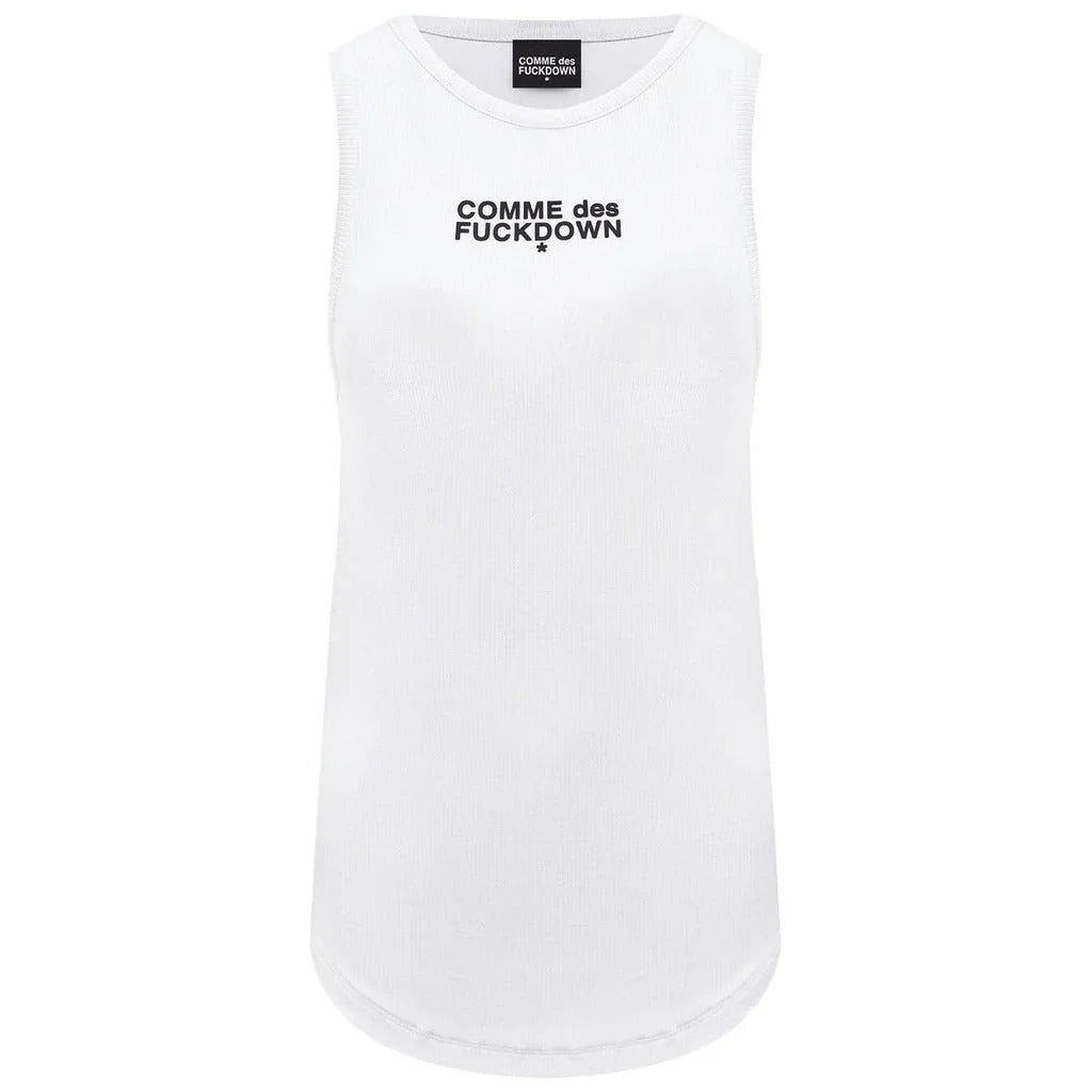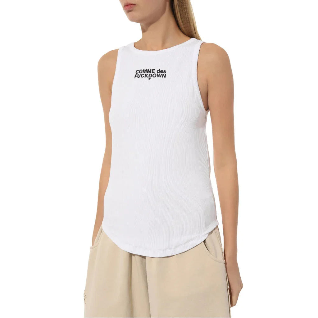 Comme des Fuckdown white cotton rib tank top with rubber logo print Lesen Sie mehr