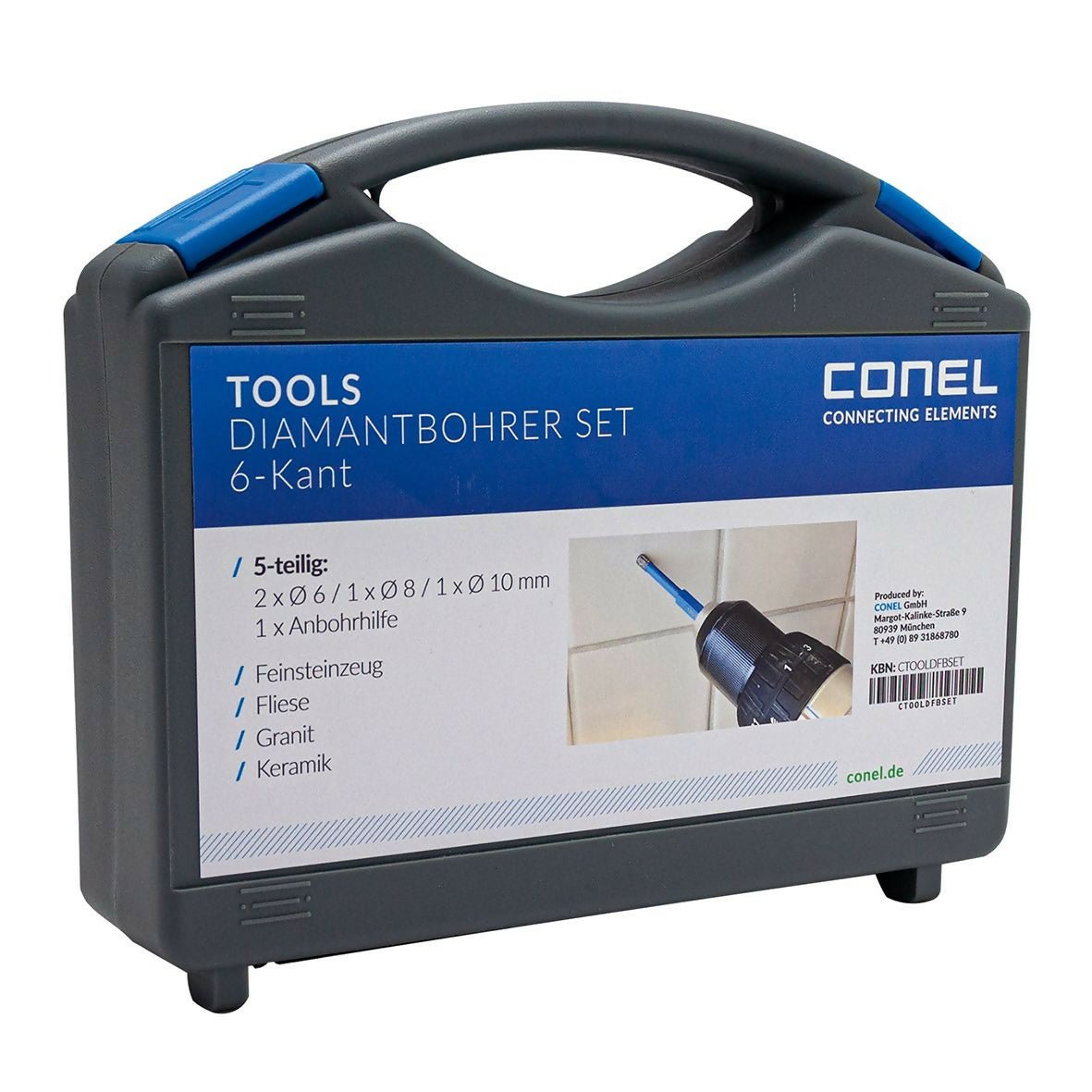 CONEL Diamant Fliesenbohrkronen Set 5-tlg. – 2×6 mm, 1×8 mm, 1×10 mm + Zentrierhilfe