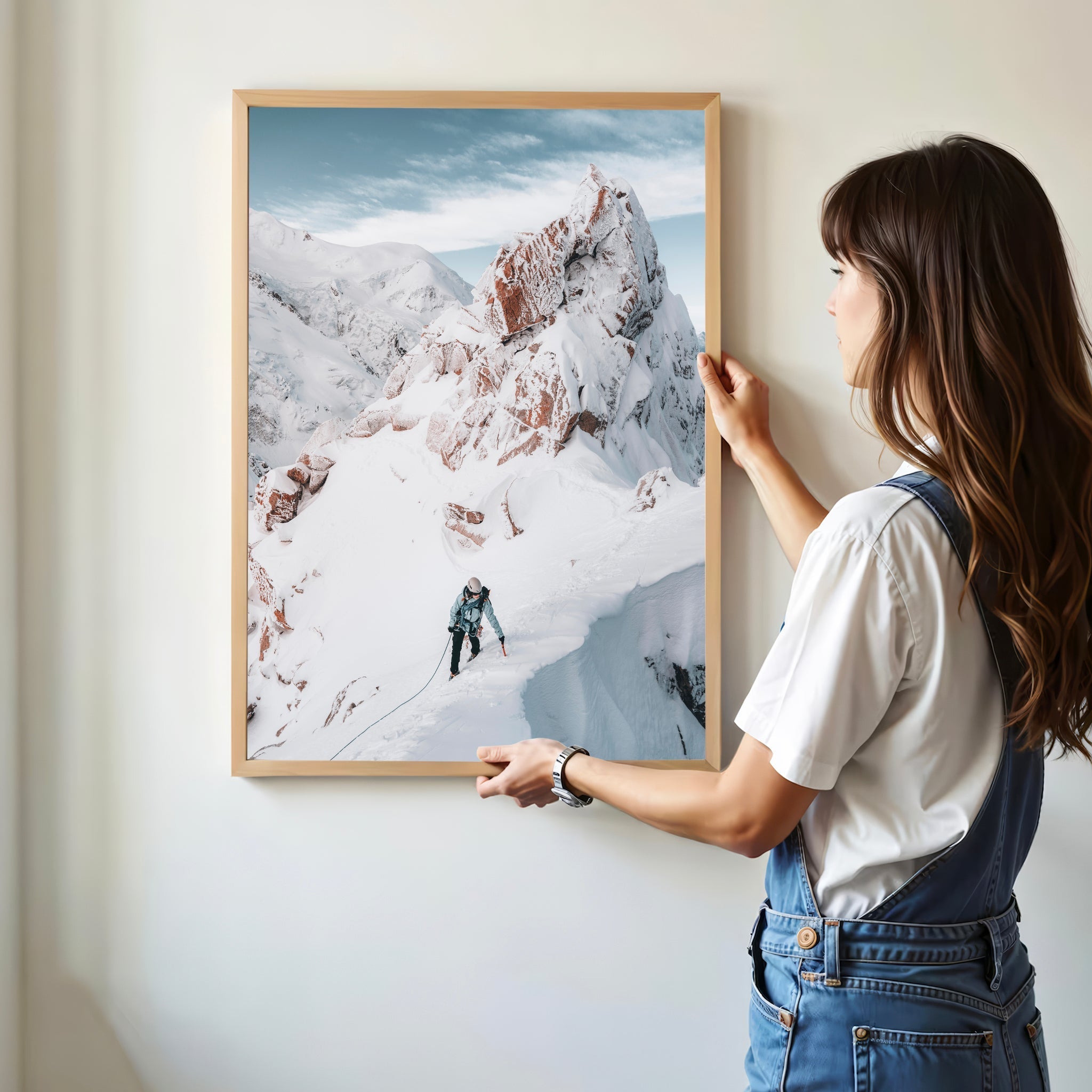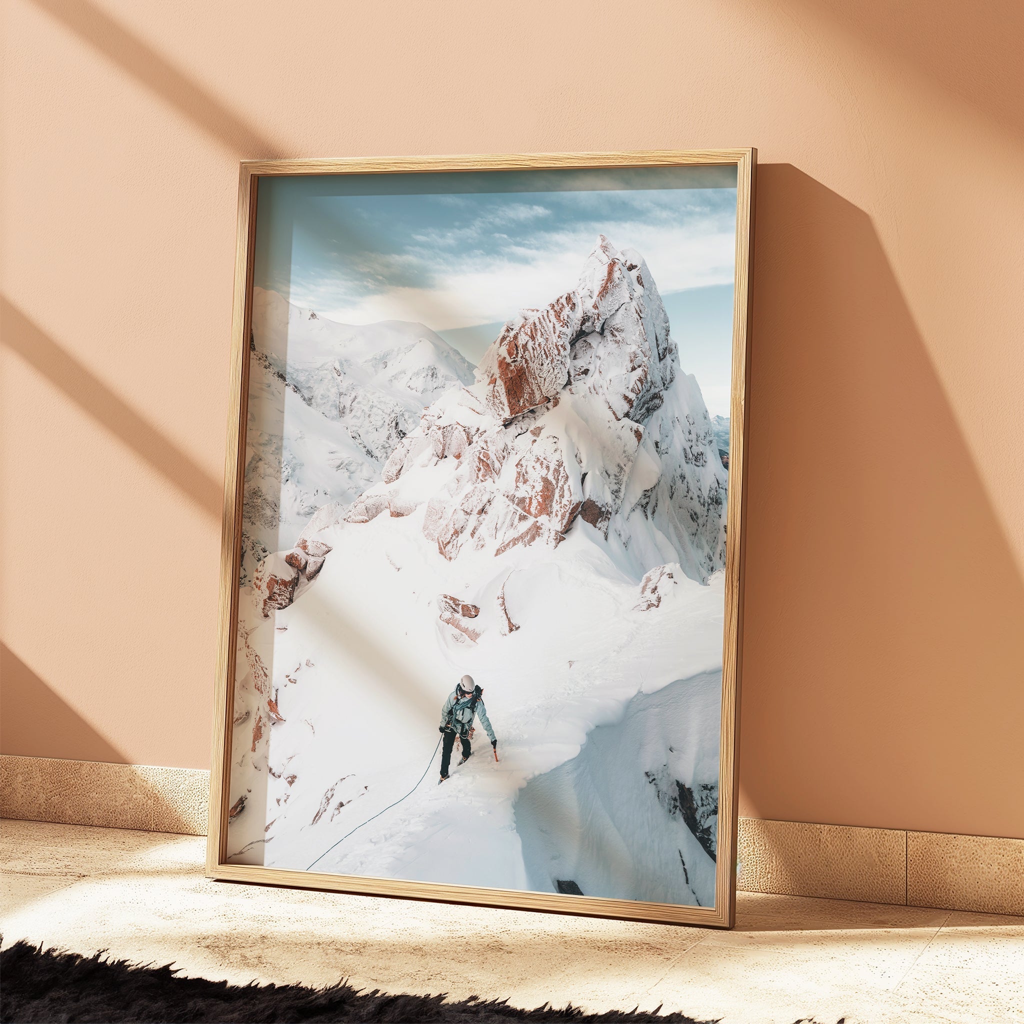 A lone climber on Cosmiques Ridge—just snow, rock, and the thrill of the ascent. A true alpine adventure captured in... Lesen Sie mehr