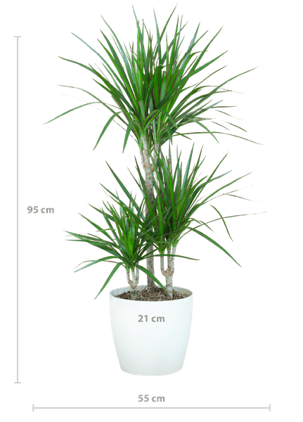 Ihre langen, schmalen Blätter erinnern an eine Palme und verleihen jedem Raum eine elegante, tropische Note. Dank ihres robusten Stammes, in dem sie Wasser und Nährstoffe speichert, ist die Dracaena eine besonders pflegeleichte Pflanze und eignet sich perfekt für Anfänger oder Vielbeschäftigte.