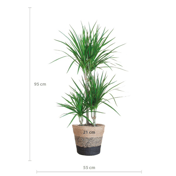 Die Dracaena Marginata, auch bekannt als Drachenbaum, ist eine pflegeleichte Zimmerpflanze, die exotisches Flair in jeden Raum bringt. Mit einer Höhe von ca. 95cm und einem Topfdurchmesser von 21cm eignet sie sich hervorragend für Wohnzimmer, Büros oder Eingangsbereiche. Ihr kräftiger Stamm und die langen, schmalen, grünen Blätter erinnern an eine kleine Palme und verleihen jedem Interieur eine tropische Note.
