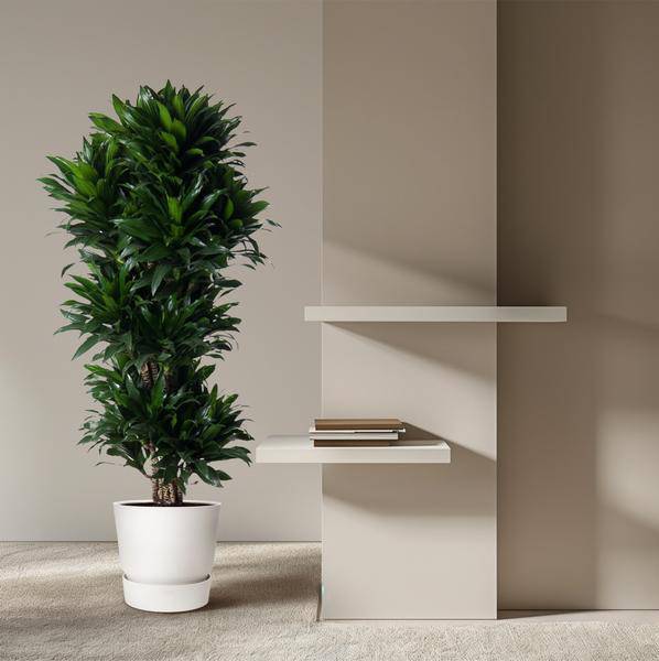 Charakteristisch sind ihre dunkelgrünen, glänzenden Blätter, die in einer harmonischen Rosettenform angeordnet sind. Die robusten Blätter mit leicht gewelltem Rand verleihen der Pflanze ein modernes und zugleich luxuriöses Erscheinungsbild. Unter idealen Bedingungen kann die Dracaena Compacta sogar kleine, duftende Blüten hervorbringen, auch wenn dies im Innenbereich selten vorkommt.