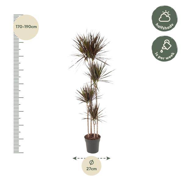 Die Dracaena Magenta ist eine dekorative Zimmerpflanze, die mit ihrer eleganten Wuchsform und den auffälligen Blattfarben sofort ins Auge fällt. Mit einer Höhe von ca. 180cm und einem Topfdurchmesser von Ø27cm bringt sie tropisches Flair in Ihr Zuhause, Büro oder den Wintergarten.
