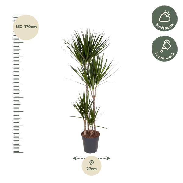 Für den sicheren Versand wird die Pflanze in einer stabilen Spezialbox fixiert und zusätzlich durch eine Schutzabdeckung geschützt. So erreicht Sie Ihr Drachenbaum frisch, gesund und unversehrt – bereit, Ihr Zuhause mit exotischer Eleganz zu verschönern.