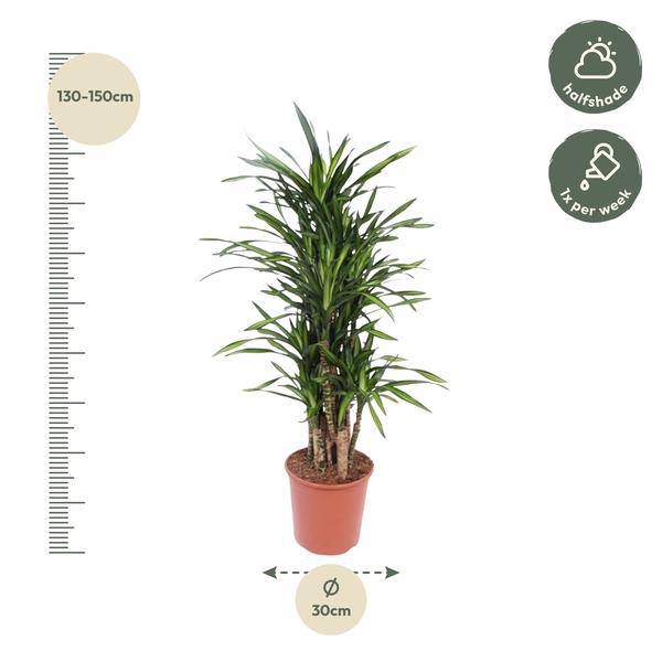 Die Dracaena Riki – auch bekannt als Drachenbaum – ist eine stilvolle Zimmerpflanze, die mit ihrem eleganten, aufrechten Wuchs und ihrem besonderen Blattwerk überzeugt. Mit einer Höhe von ca. 140cm und einem Topfdurchmesser von 30cm ist sie die ideale Wahl für alle, die einen dekorativen, pflegeleichten Raumakzent setzen möchten.