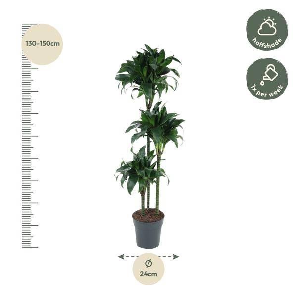 Mit einer Höhe von ca. 140cm und einem Ø24cm Topf ist die Dracaena Tatuade die perfekte Wahl für große Wohnräume, Arbeitsbereiche, Wintergärten oder Eingangsbereiche. Am besten gedeiht sie an einem Standort mit hellem, indirektem Licht, sie kommt aber auch mit Halbschatten zurecht. Direkte Sonne sollte vermieden werden, da diese die Blätter beschädigen kann.