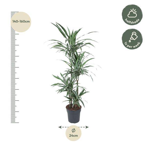 Mit einer Höhe von ca. 150cm und einem Ø24cm Topf ist sie die perfekte Wahl, um Wohnzimmer, Büro, Wintergarten oder Flur in eine grüne Wohlfühloase zu verwandeln. Die Pflanze bevorzugt einen Standort mit hellem, indirektem Licht, kommt aber auch mit Halbschatten gut zurecht. Direkte Sonne sollte vermieden werden, um die Blätter nicht zu beschädigen.