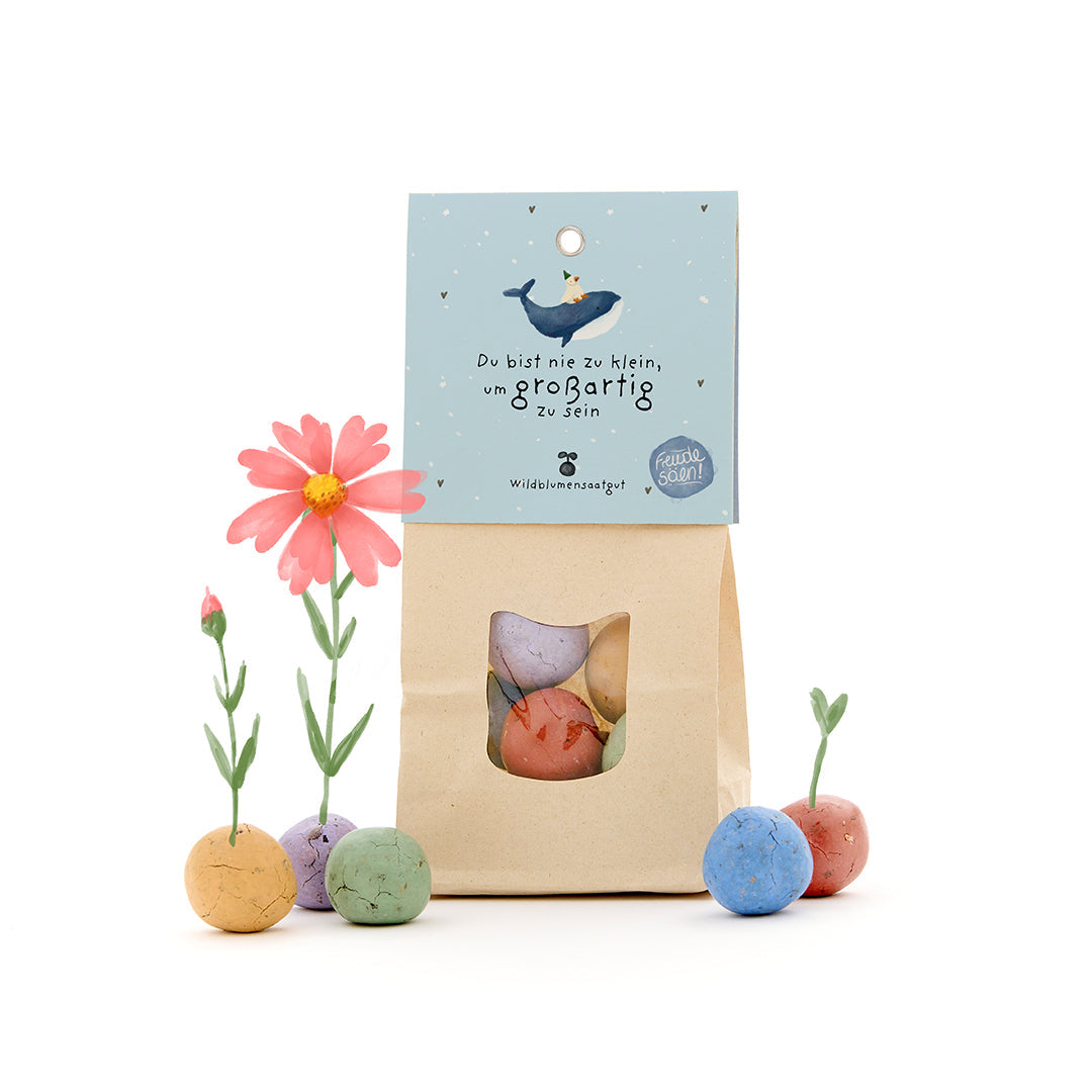 Verschenke einen blühenden Mutmacher: In dieser hübsch gestalteten Papiertüte stecken 8 Wildblumen-Saatkugeln – voller Farbe, Hoffnung und Symbolkraft. Die aufgedruckte... Lesen Sie mehr