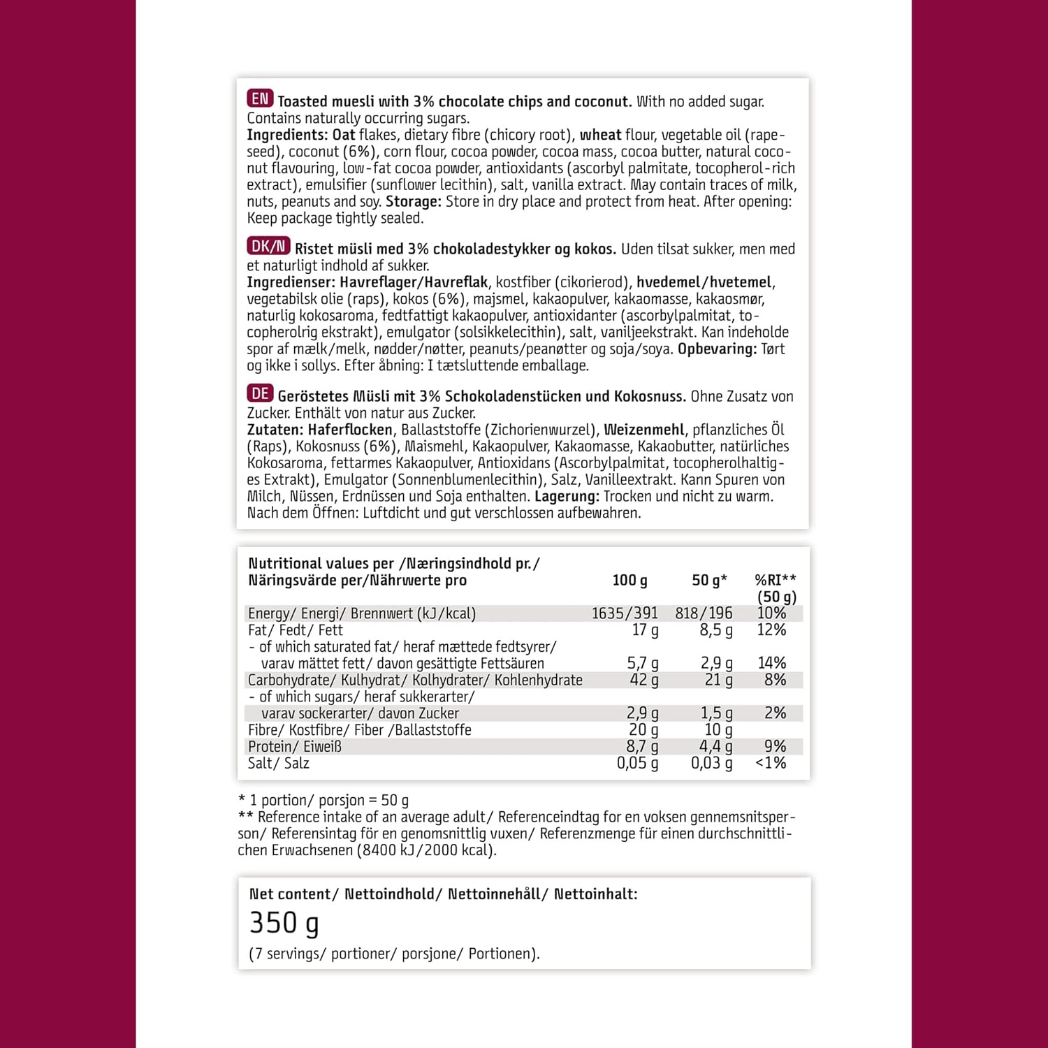 EASIS Knuspermüsli Ohne Zuckerzusatz mit Schokolade & Kokosflocken | Knusprige Müsli ohne Zucker | Ideal für Milch & Joghurt | Gesundes Frühstück, Perfekter Start in den Tag | 350 g