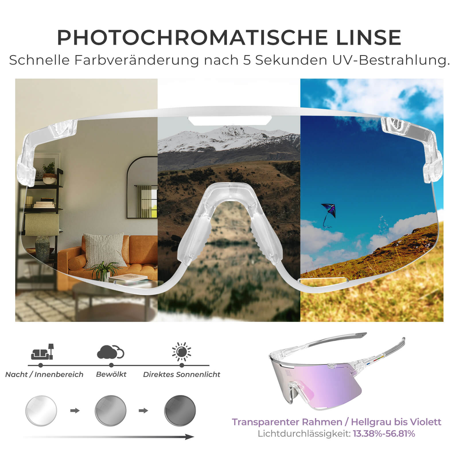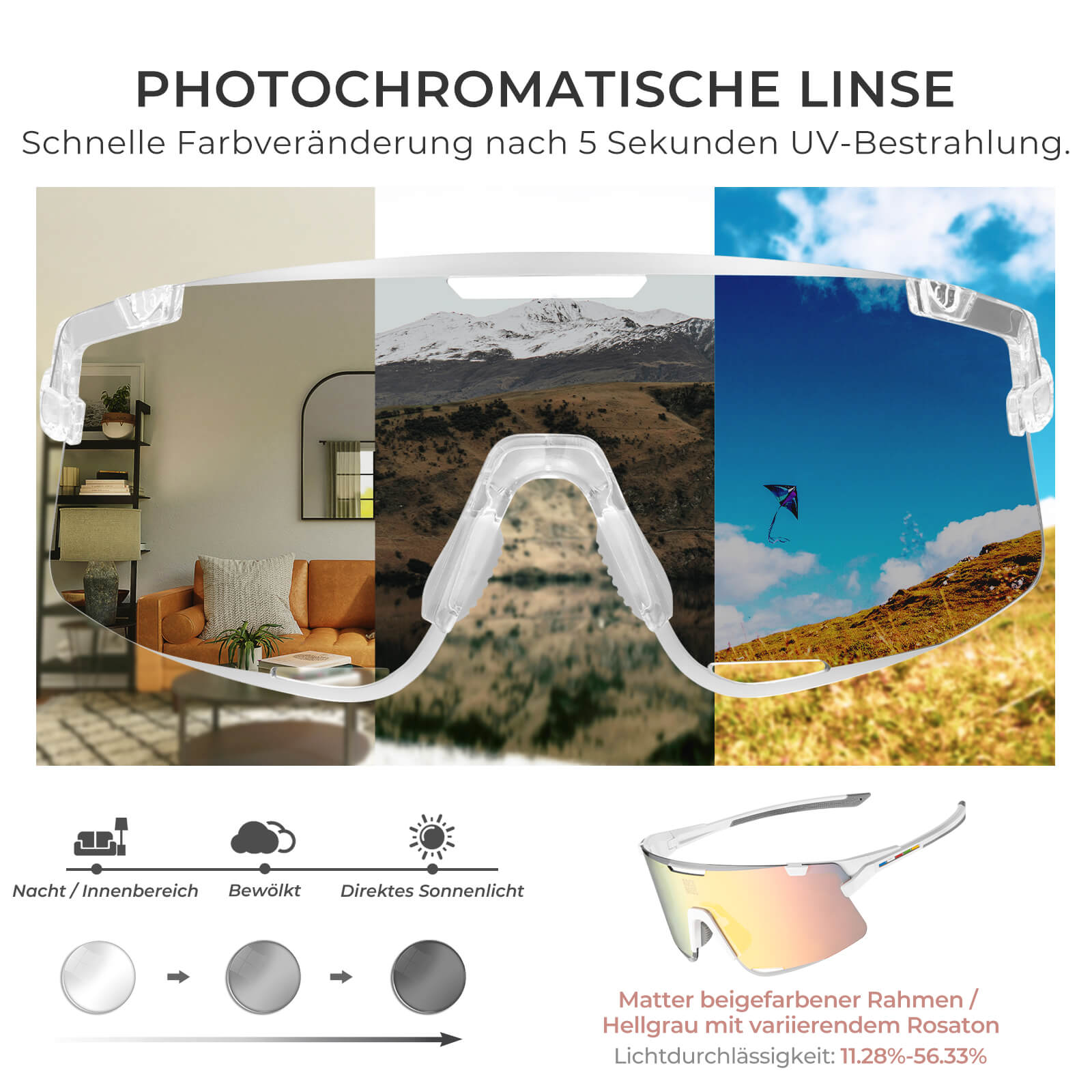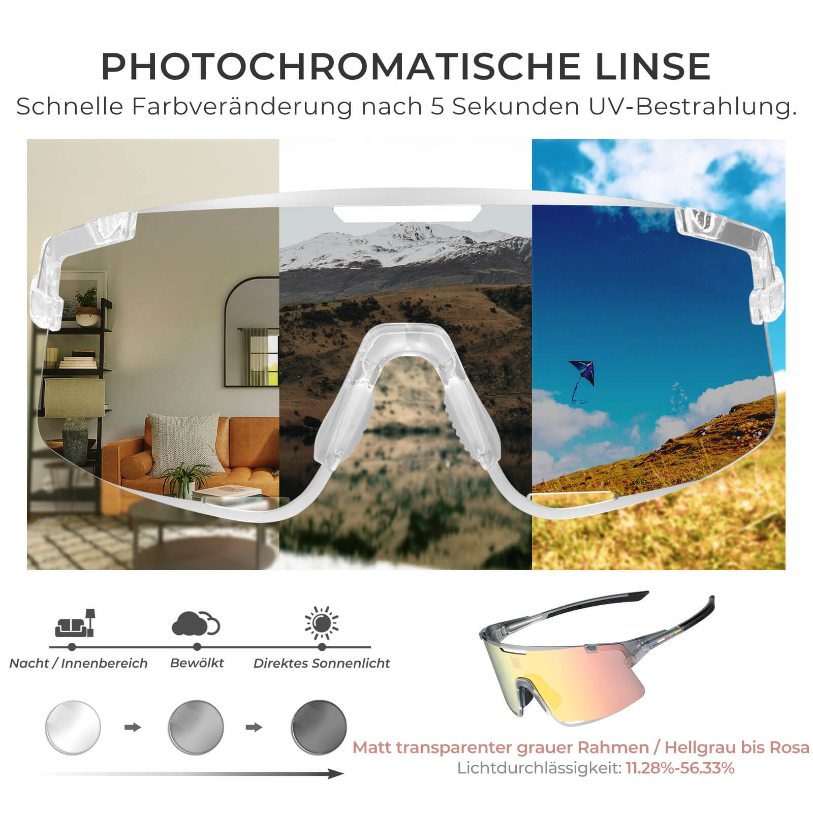 Photochromes Glas: Passt sich automatisch an Lichtverhältnisse an – ideal für den ganztägigen Einsatz