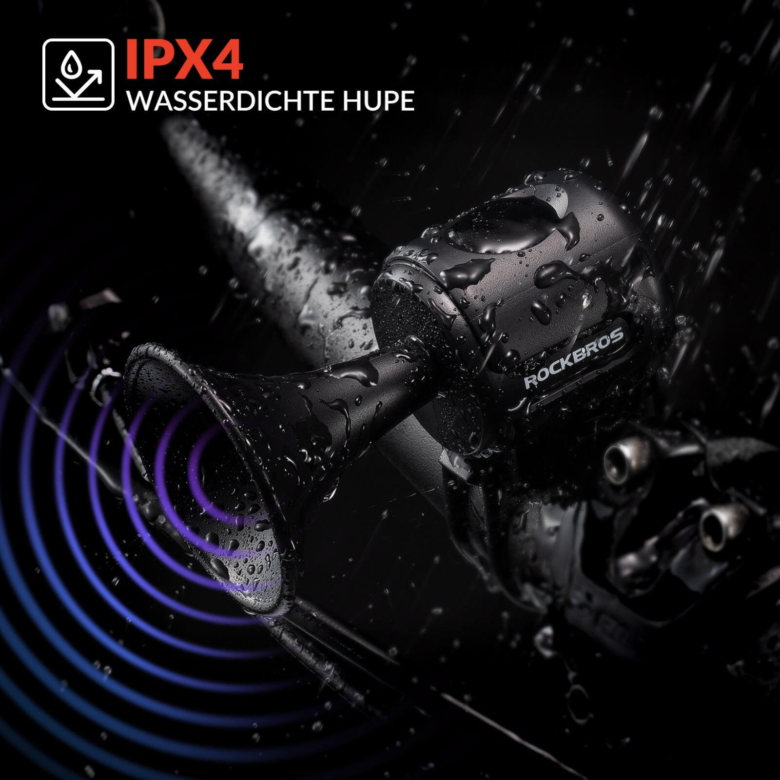 ROCKBROS Lautstarke Fahrradhupe (120 dB), IPX4 wasserdicht, einfache Bedienung, flexible Befestigung und austauschbare Batterien – kompakt und robust für sichere Fahrten.