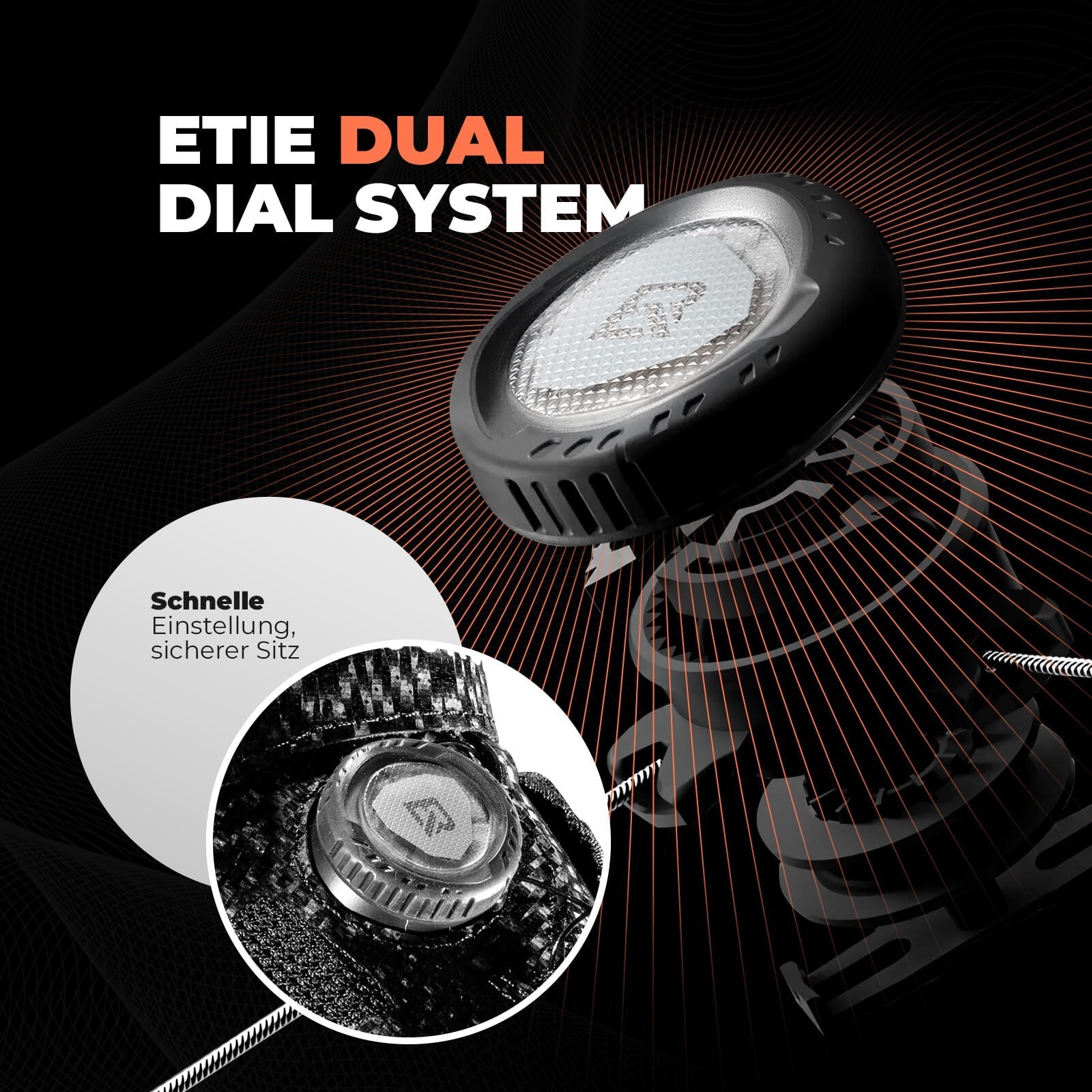 ETIE-DUAL-DREHVERSCHLUSSSYSTEM: Zwei fein justierbare Drehverschlüsse ermöglichen eine millimetergenaue Anpassung. Sie reduzieren den Druck auf den Spann, unterstützen das Fußgewölbe und ermöglichen ein schnelles, sicheres An- und Ausziehen – individuell, komfortabel und stabil.
