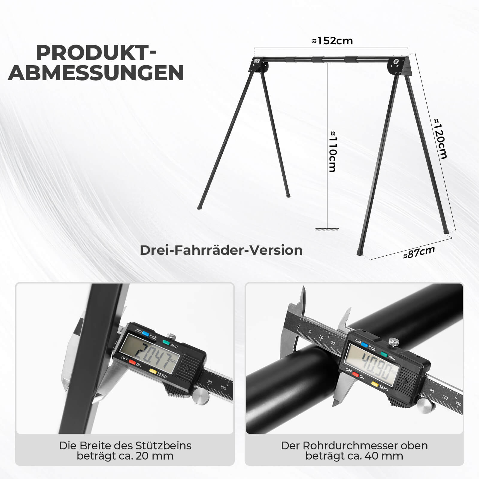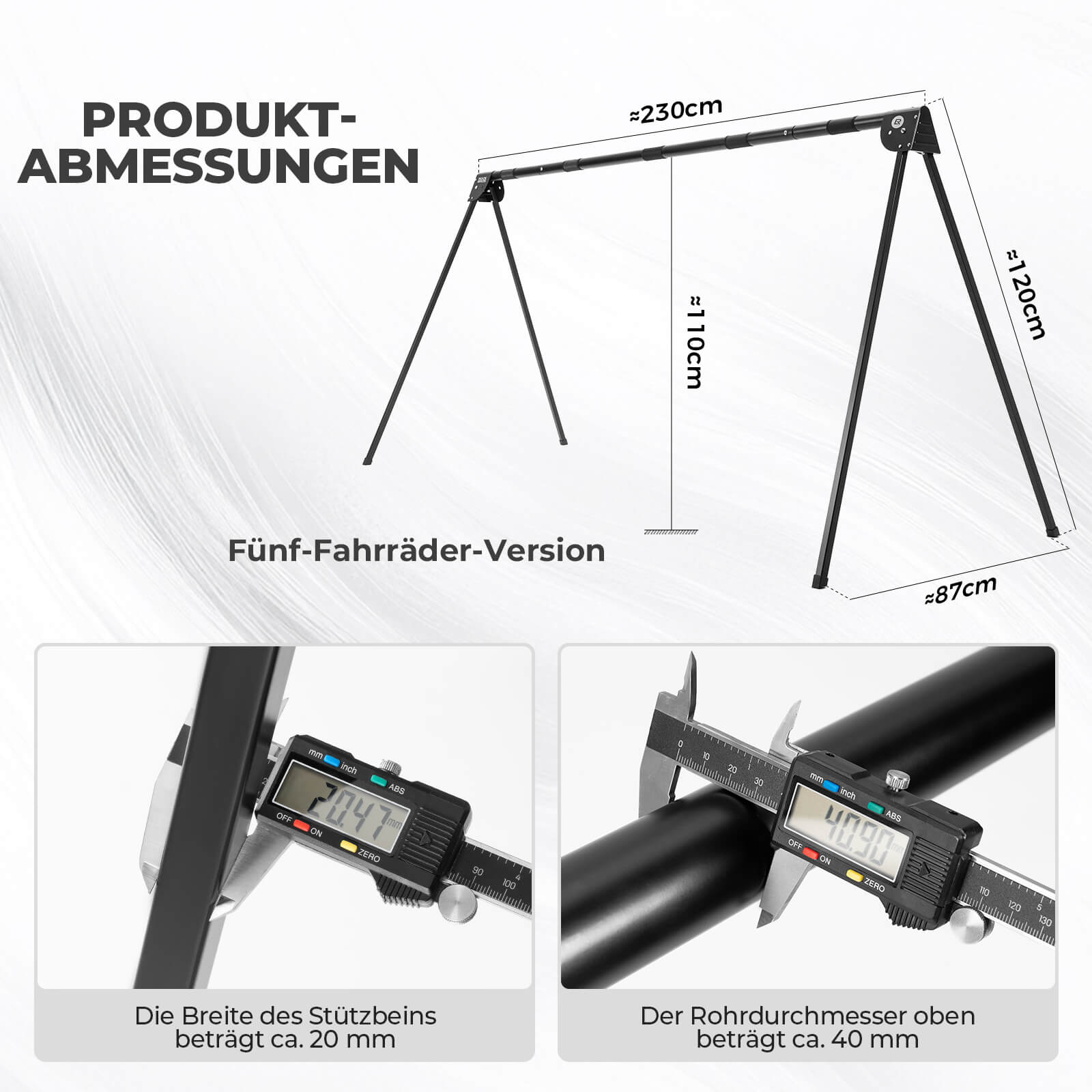 Kompakt zusammenklappbar, nimmt wenig Platz ein und ist kompatibel mit Rennrädern, Mountainbikes und mehr (Breite der Stützbeine: ca. 20 mm, oberer Rohrdurchmesser: ca. 40 mm.).