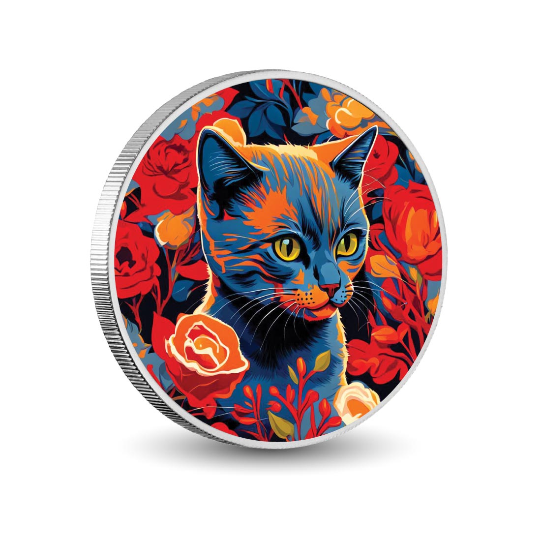 Featuring a beautifully stylized cat encircled by a vibrant, colorful floral background, this limited edition coin captures a sense of whimsy and wonder. With a striking blue and orange color palette, the cat stands out against the stunning array of red, orange, and yellow flowers, creating a visual masterpiece that is sure to captivate.