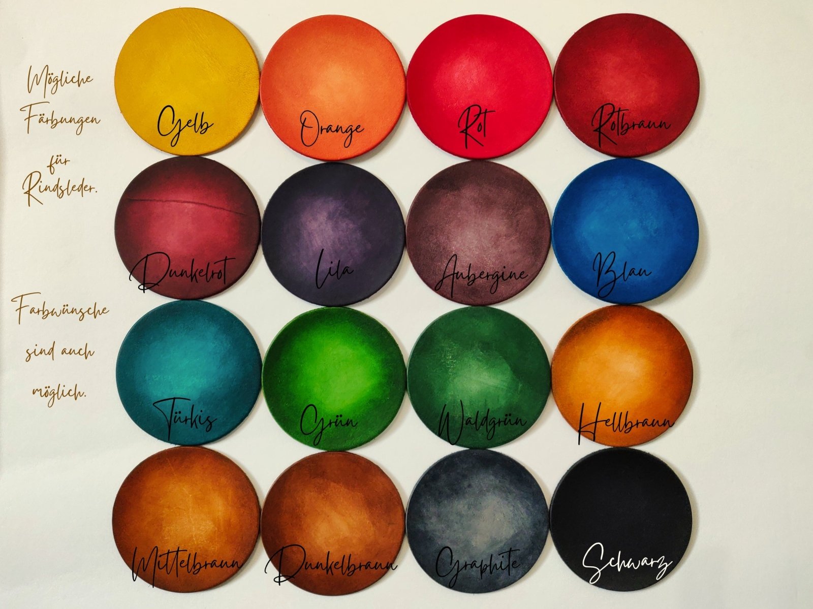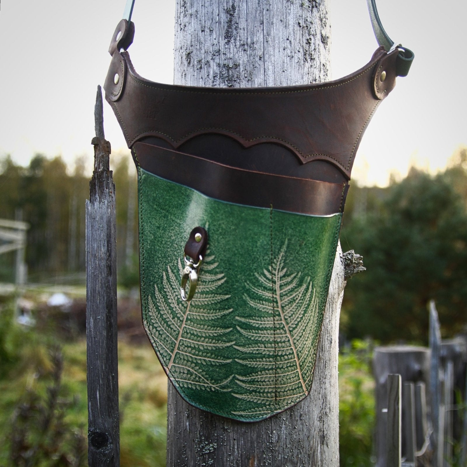 Aus robustem, braunem Fettleder gefertigt, begleitet dich dieser Gürtel durch Erde, Wind und Wetter. Das vorderste Fach besteht aus hellem Blankleder und trägt ein handgedrucktes Blatt – individuell eingefärbt in deiner Wunschfarbe.