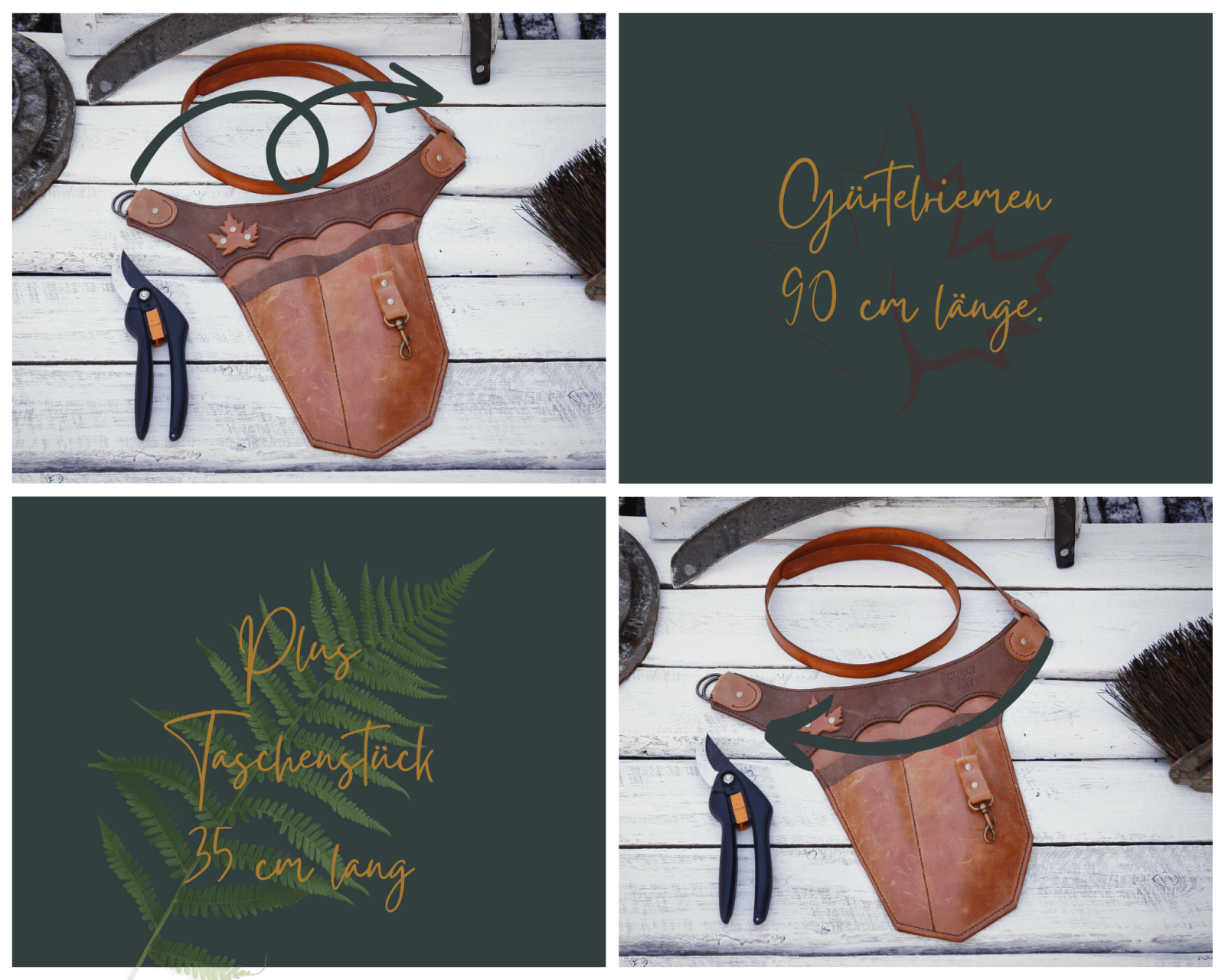 Der Rest des Gartengürtels wird aus gewachstem Leder gefertigt. Bei Nutzung entwickelt diese Art Leder eine wunderschöne Patina.