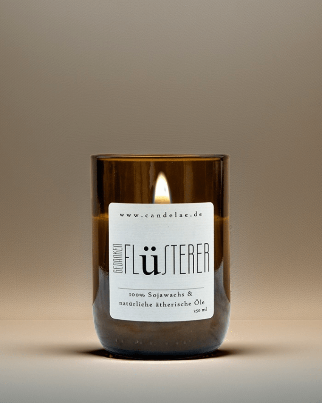 Erlebe die belebende Kraft natürlicher Düfte mit der Duftkerze „Gedankenflüsterer“. Handgegossen aus 100 % pflanzlichem Sojawachs und natürlichen ätherischen Ölen in ein Glas aus recycelter Weinflasche – für frische Energie, klare Gedanken und fokussiertes Arbeiten.