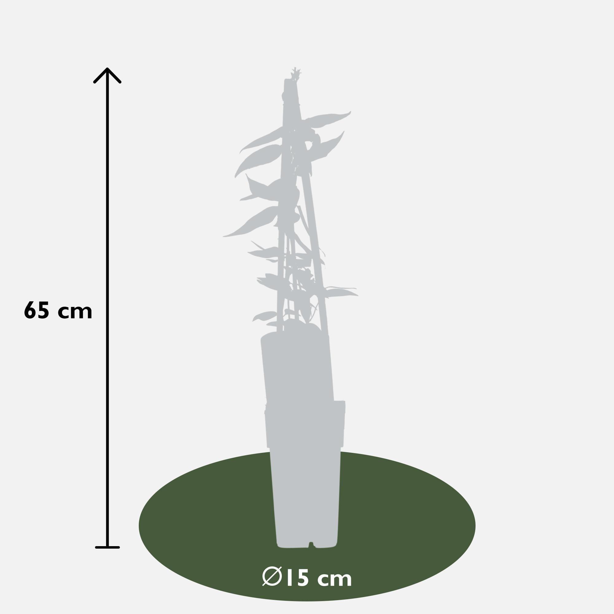 Das Geißblatt – Lonicera henryi (Ø15cm – H65cm) ist eine elegante, immergrüne Kletterpflanze, die mit ihren dekorativen Blättern und duftenden Blüten überzeugt. Anders als viele andere Geißblattarten behält die Lonicera henryi in milden Wintern ihr Laub und sorgt so ganzjährig für ein attraktives, grünes Erscheinungsbild.