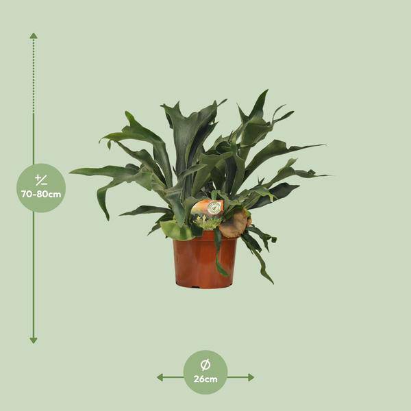 Der Geweihfarn (Platycerium bifurcatum) ist eine außergewöhnliche Zimmerpflanze, die durch ihre auffälligen, geweihartig verzweigten Blätter sofort ins Auge fällt. Mit einer Höhe von ca. 80cm und einem Topfdurchmesser von 26cm eignet sich diese Pflanze perfekt, um jedem Raum eine grüne, tropische Note zu verleihen.