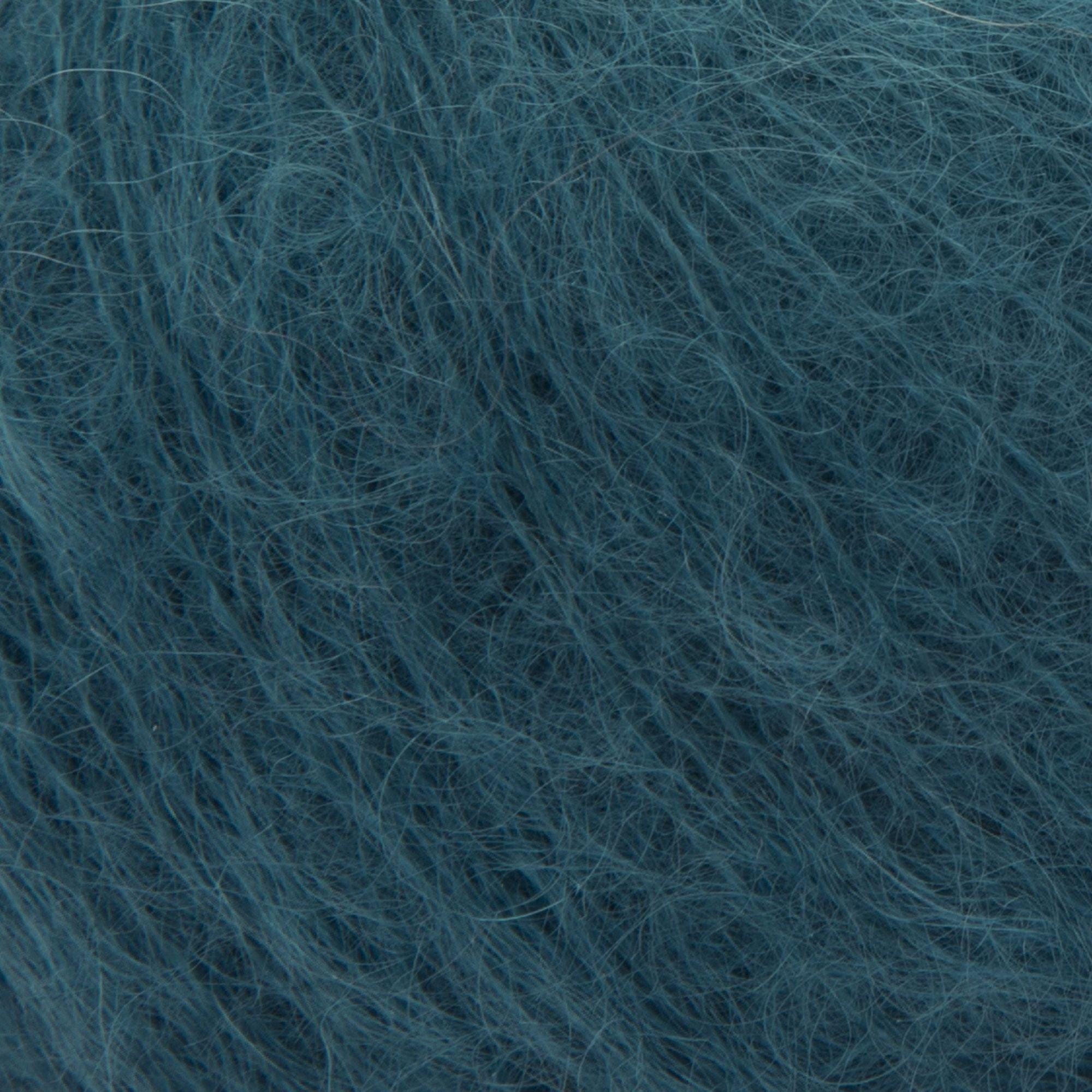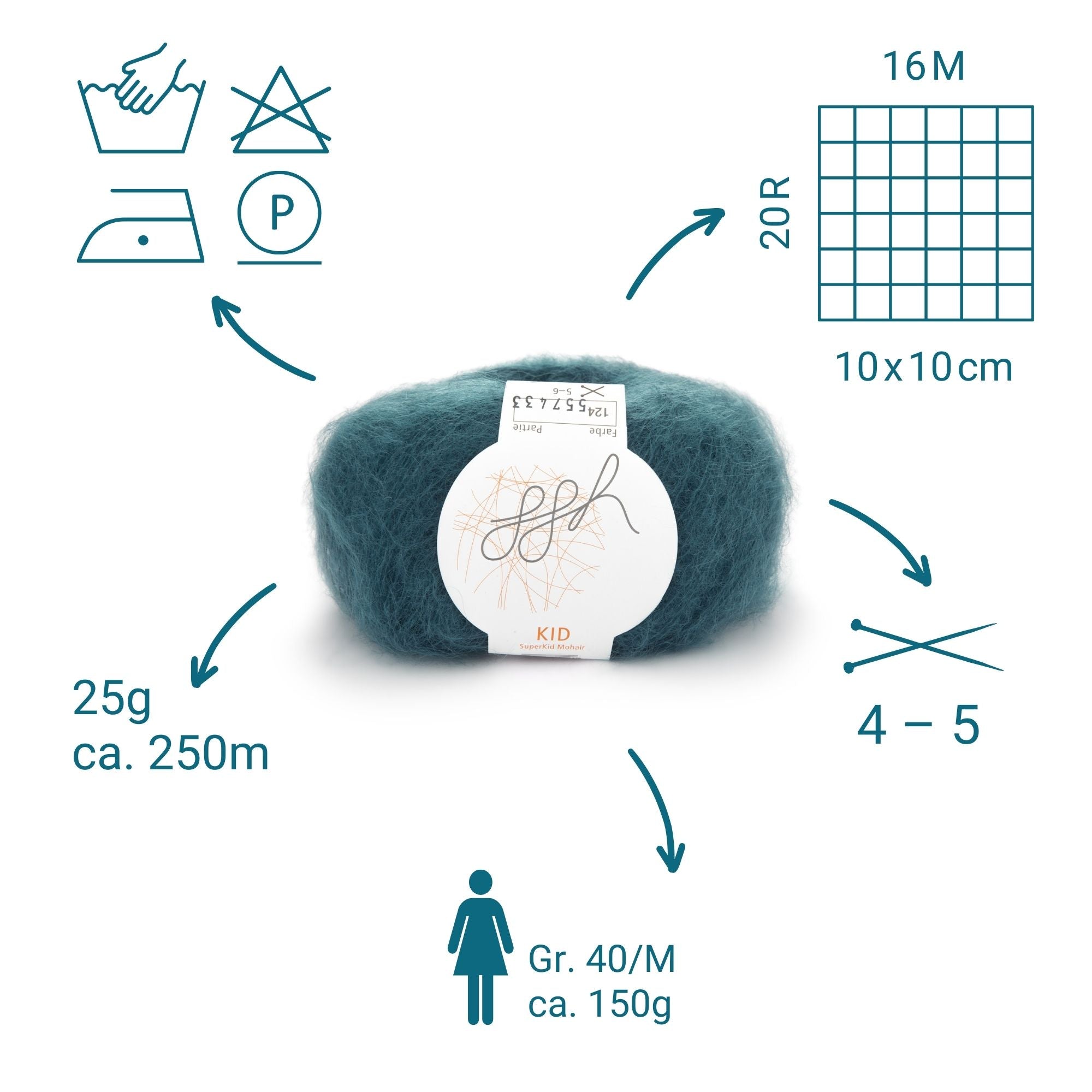 ggh Kid ist ein edles Lacegarn aus 65% Super-Kid-Mohairwolle, 5% Schurwolle und 30% Polyamid. Die Super-Kid-Mohairfaser ist besonders fein und verleiht dieser Mohairwolle ihre außergewöhnliche Leichtigkeit und den weichen, flauschigen Charakter. In der Farbe 124 - Entenblau wirkt das Garn elegant und zeitlos – ideal für klassische Strickprojekte, die du lange lieben wirst. Mit nur ca. 150g lässt sich bereits ein Pullover stricken, der kaum spürbar auf der Haut liegt und gleichzeitig wunderbar wärmt.
