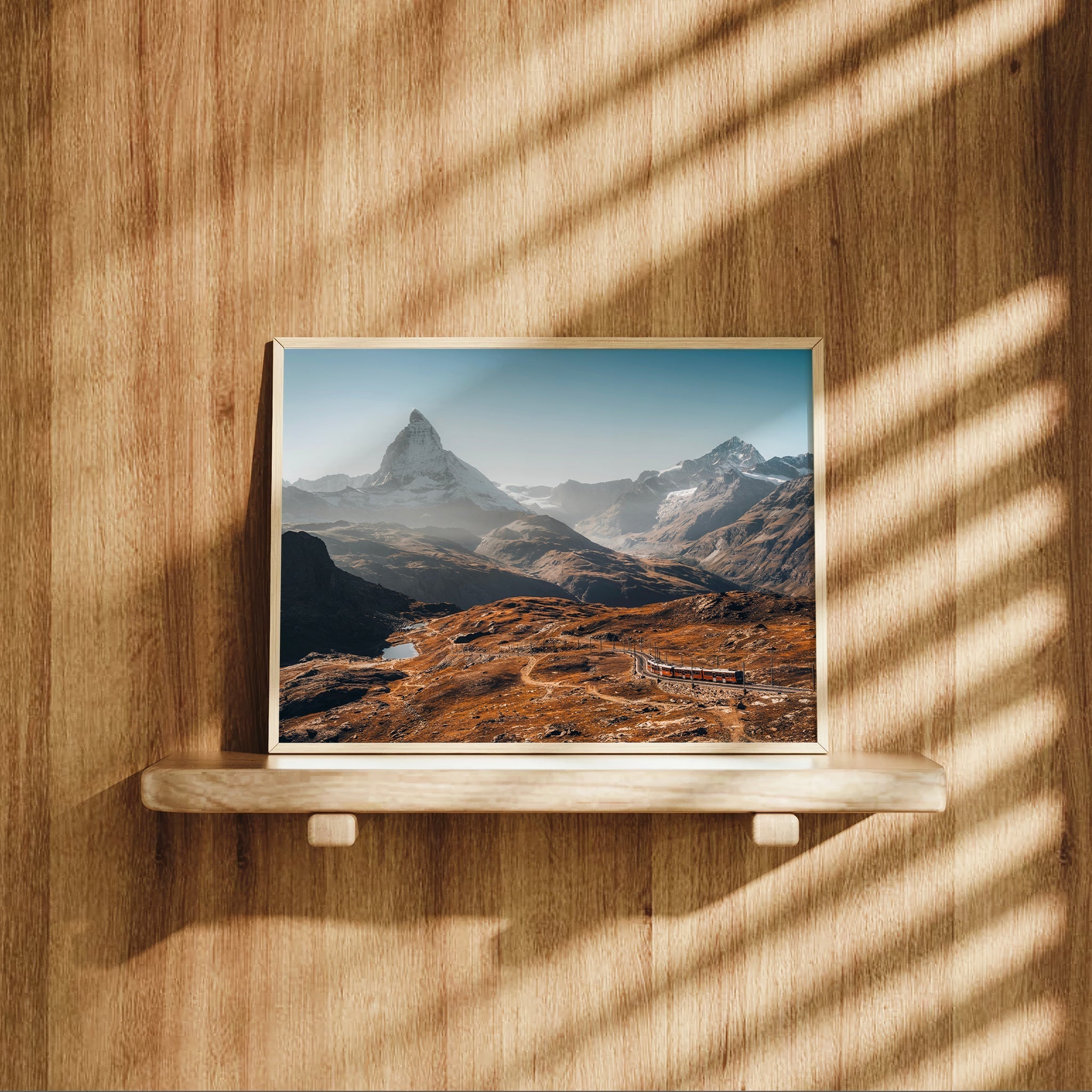 The Gornergrat train winding through the Swiss Alps, with the Matterhorn in the morning light. Lesen Sie mehr