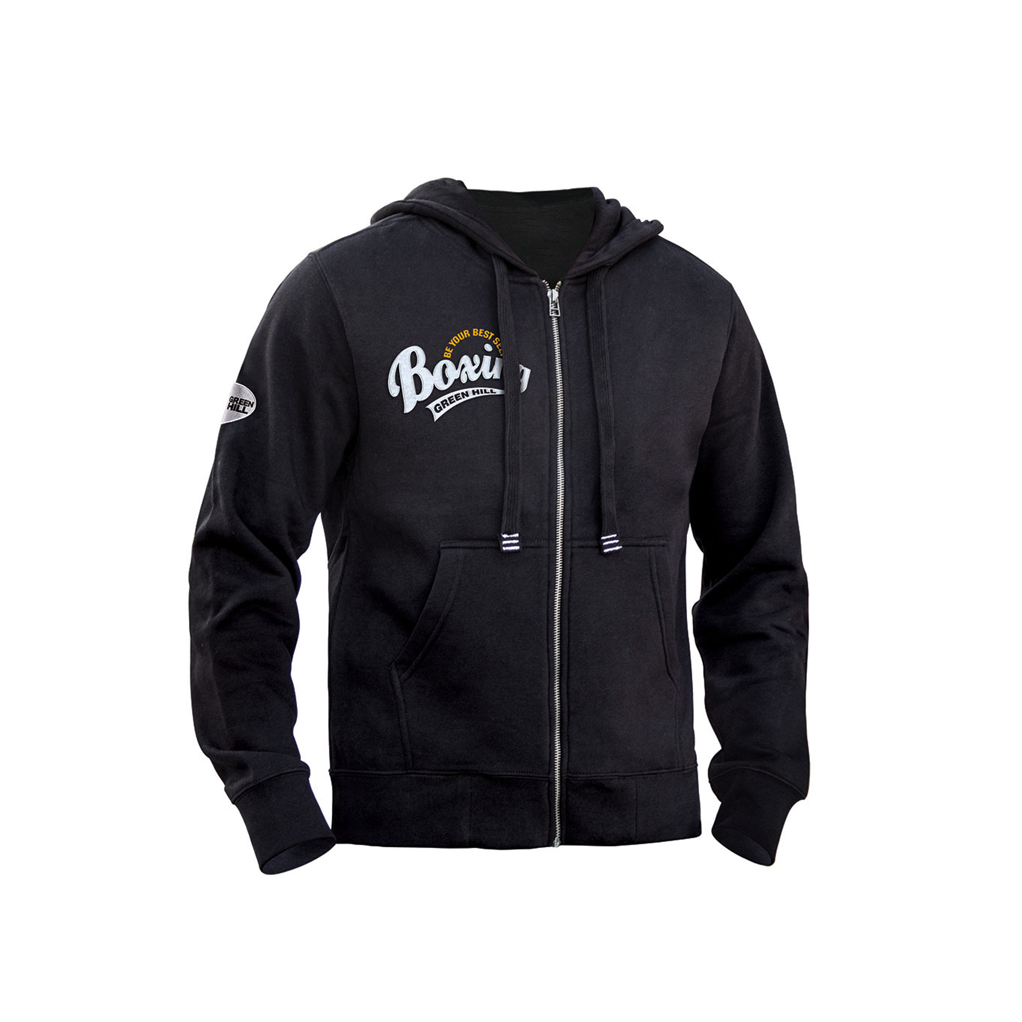 Ihr schlichtes, elegantes Schwarz-Design mit dem prominenten "Boxing" Aufdruck auf der Brust und dem gestickten Green Hill Logo auf dem Ärmel macht sie zum vielseitigen, stilvollen Begleiter. Egal ob du dich vor dem Box-Training aufwärmst, eine Laufrunde drehst oder einfach in deiner Freizeit einen klaren, sportlichen Look schätzt – diese Hoodie Jacke ist die ideale Wahl.