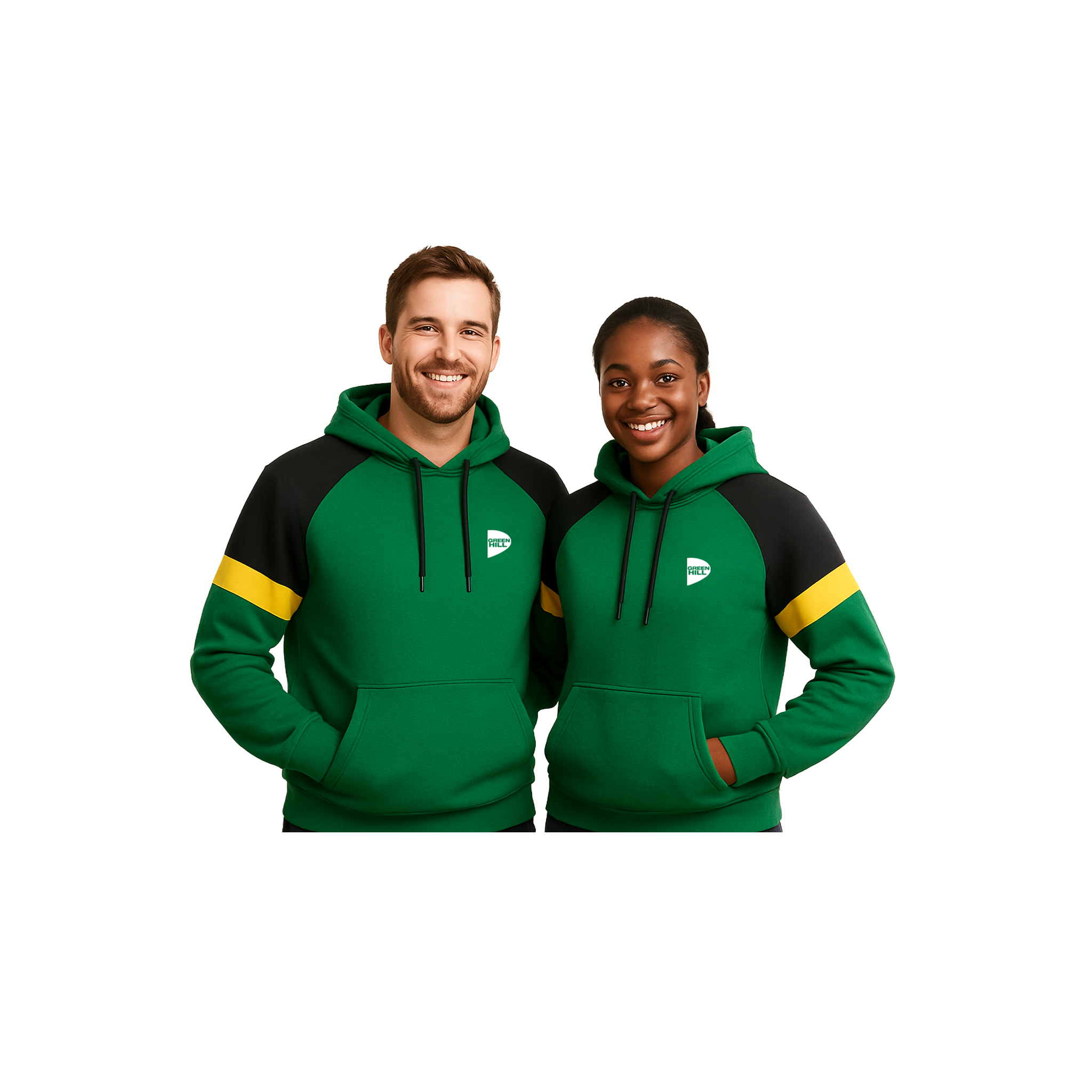 Der Hoodie präsentiert sich in einem ansprechenden Grün und wird durch stilvolle schwarz-gelbe Akzente ergänzt, die für einen modernen, sportlichen Look sorgen.