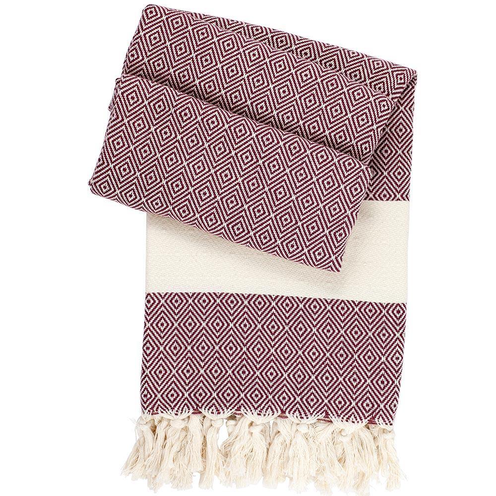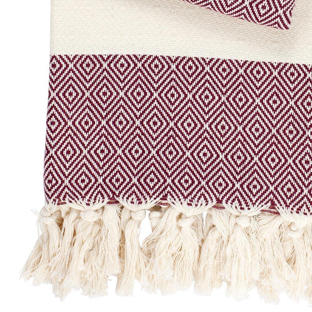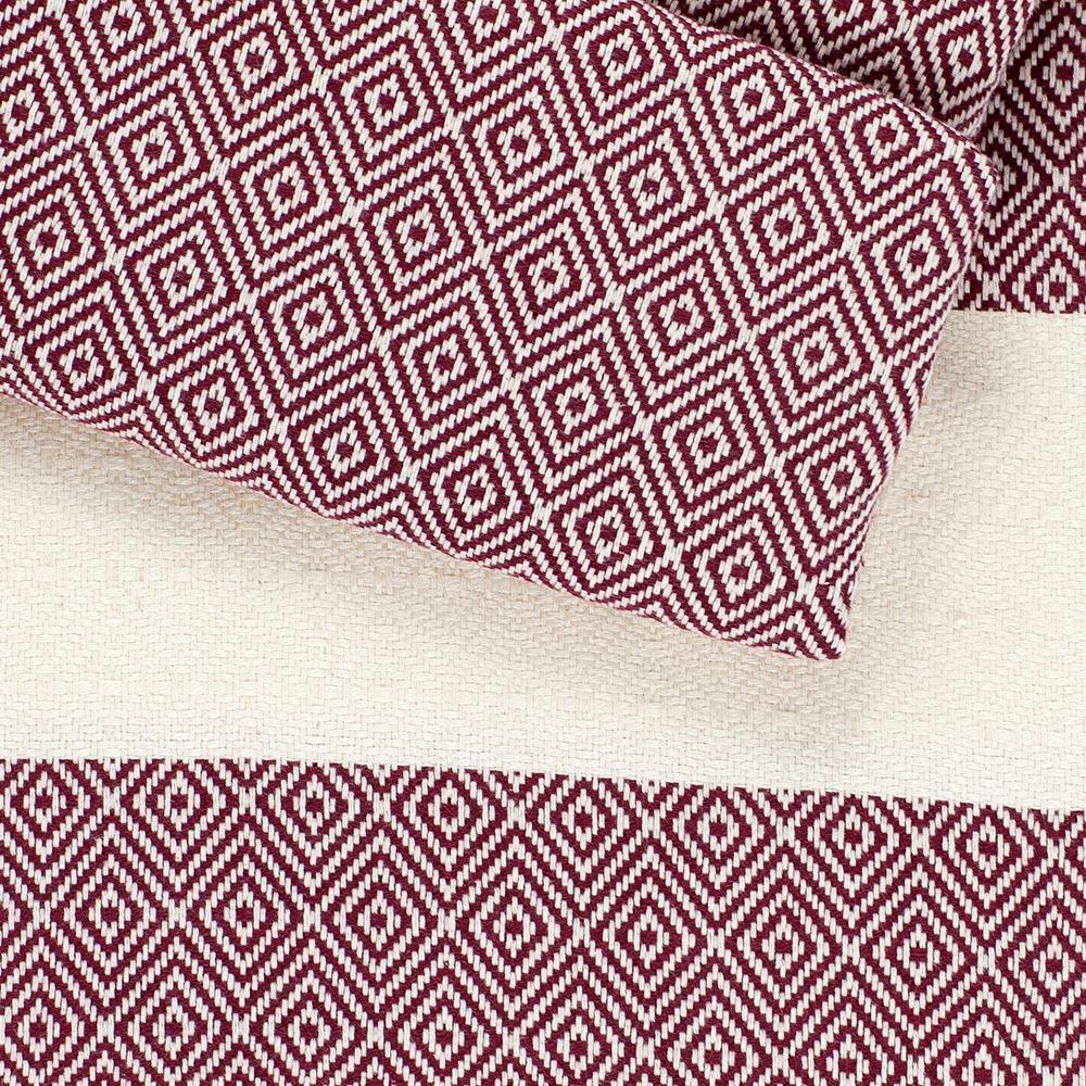ca. 100 x 170 cm, 100% Baumwolle, naturweiß/bordeaux, ca. 400 Gramm, Flächengewicht 220 g/m². Waschen bis 40 Grad, Wäschetrockner möglich (Waschanleitung Hamamtuch).