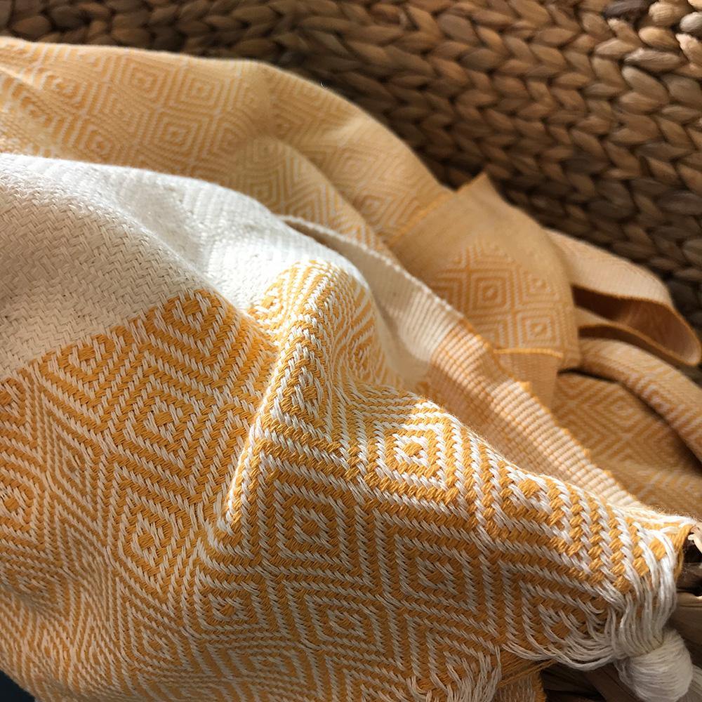 Wir beziehen das Hamamtuch Charlotte aus einer Pestemal-Manufaktur in Izmir, wo es an traditionellen, halbautomatischen Webstühlen hergestellt wird. Die Kettfäden werden anschließend von Frauen in Heimarbeit verknotet. Dieses Webmuster wird in der Türkei seit Jahrhunderten für Hamamtücher genutzt.