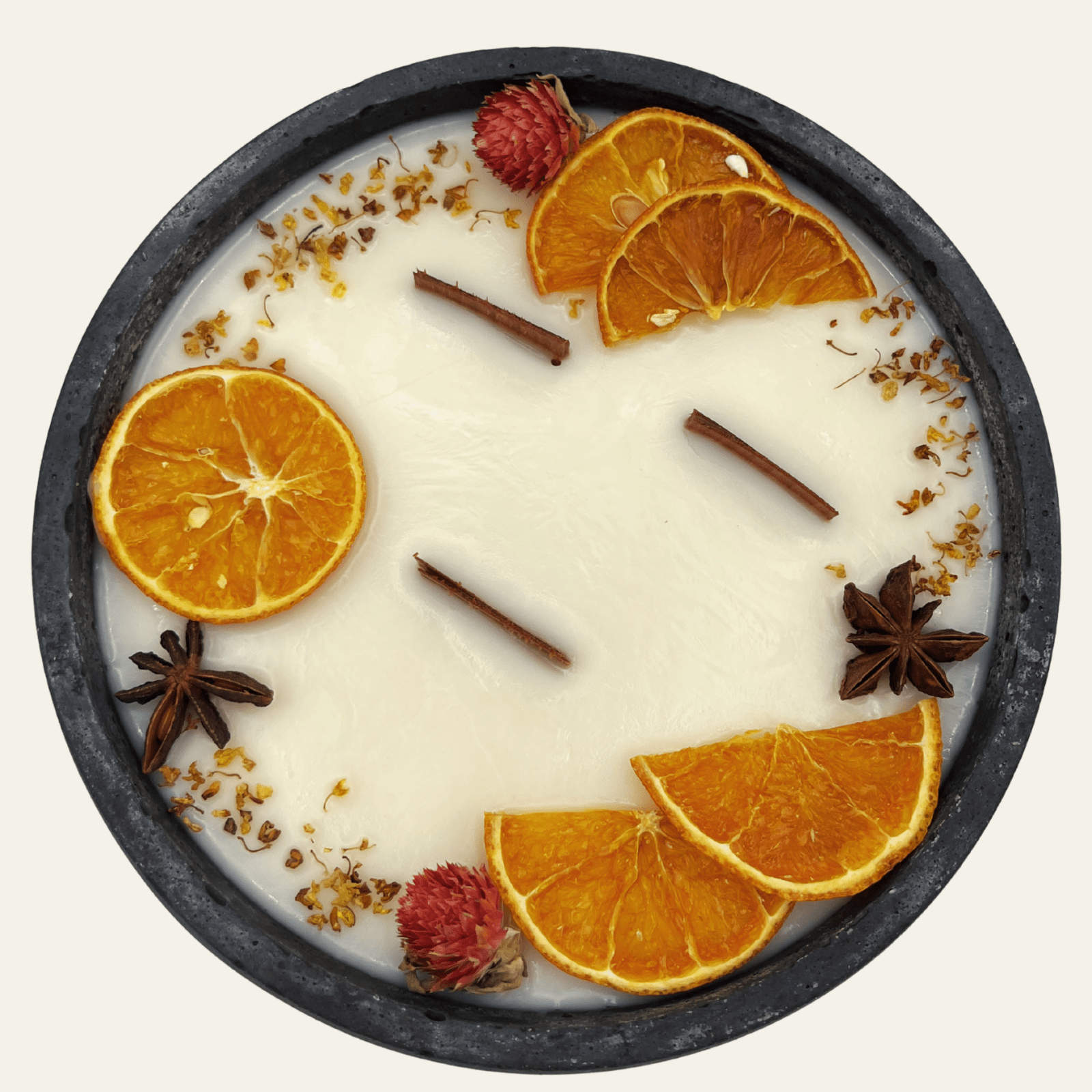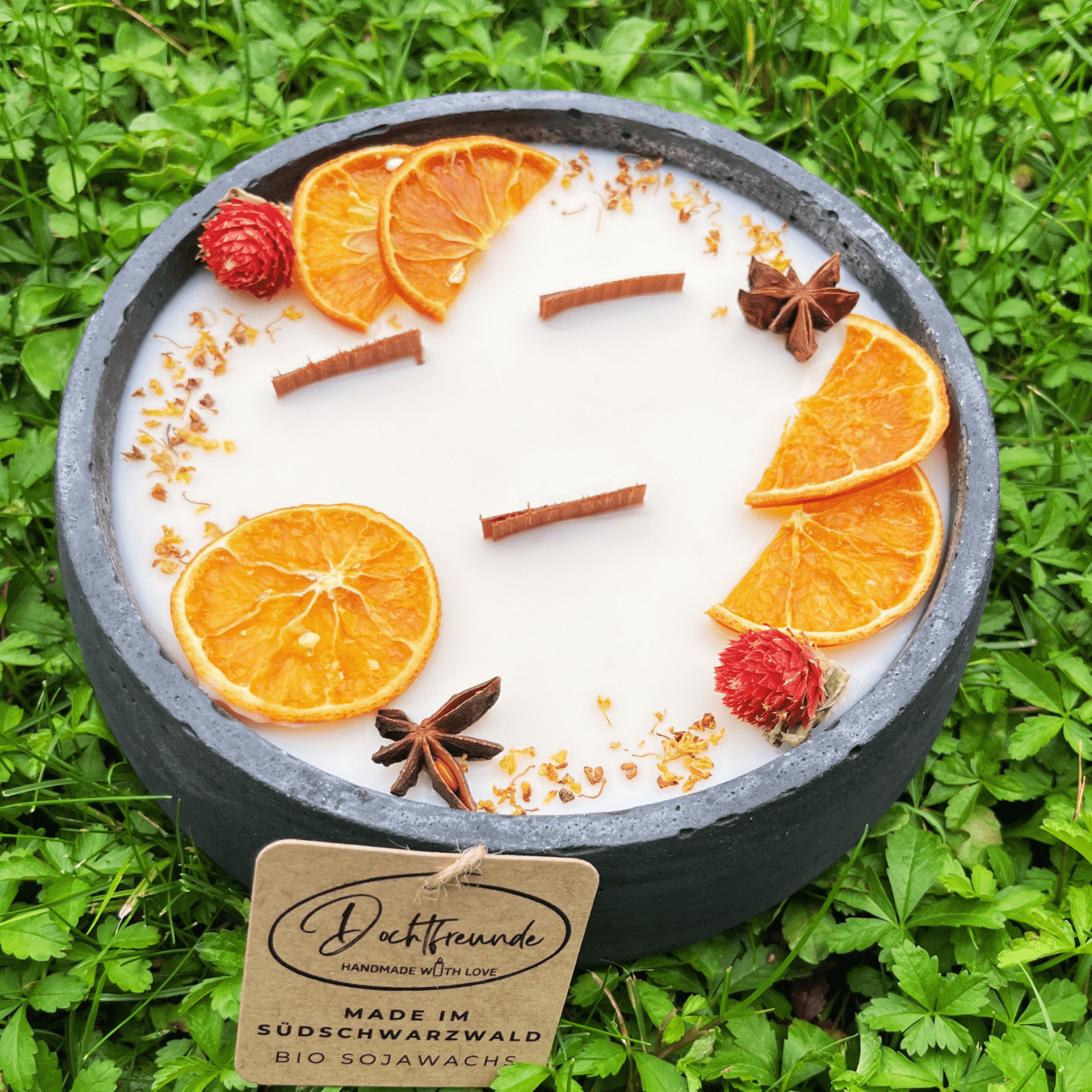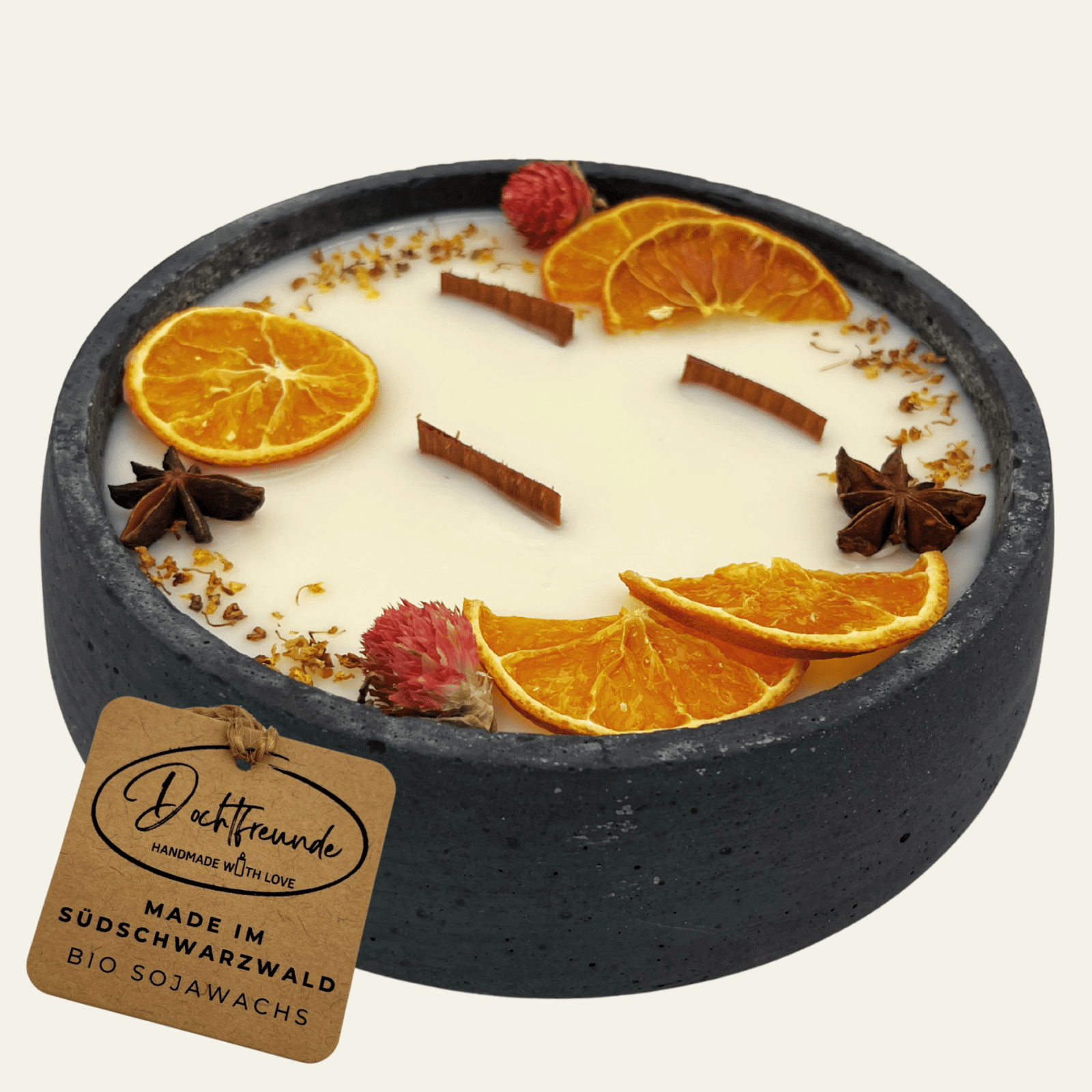 Material: Veganes Sojawachs, versiegelter Beton, Holzdocht, getrocknete Blüten.